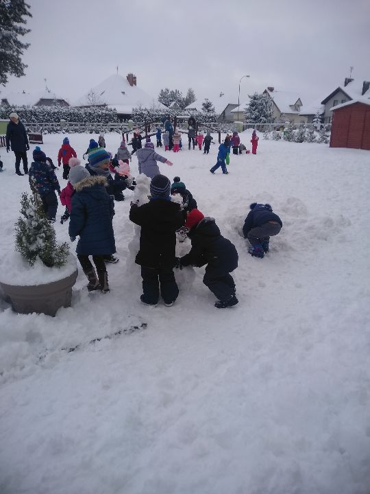 My się zimy nie boimy, a właściwie to bardzo się cieszymy, że do nas przyszła i że możemy poszaleć trochę w zimowym ogrodzie przedszkolnym. W dniu dzisiejszym udowodniliśmy, że nawet zimą w ogrodzie przedszkolnym można się świetnie bawić, bawiliśmy się w berka, lepiliśmy igloo a na koniec wspólnymi siłami ulepiliśmy bałwana:). Z czerwonymi noskami i z uśmiechem wróciliśmy do przedszkola:).