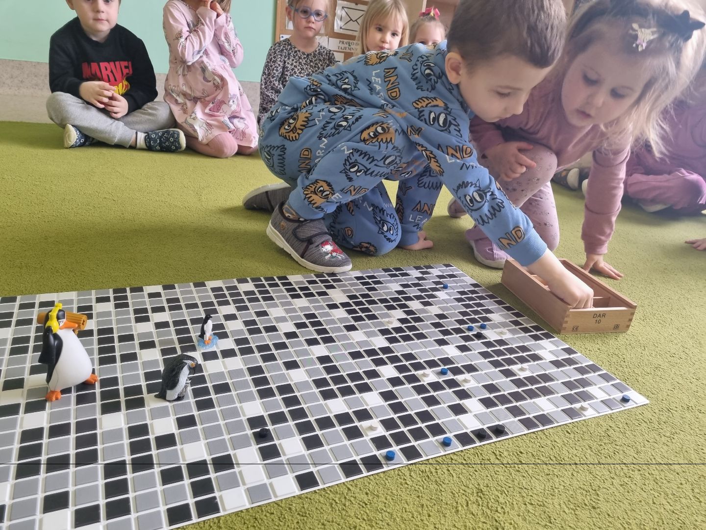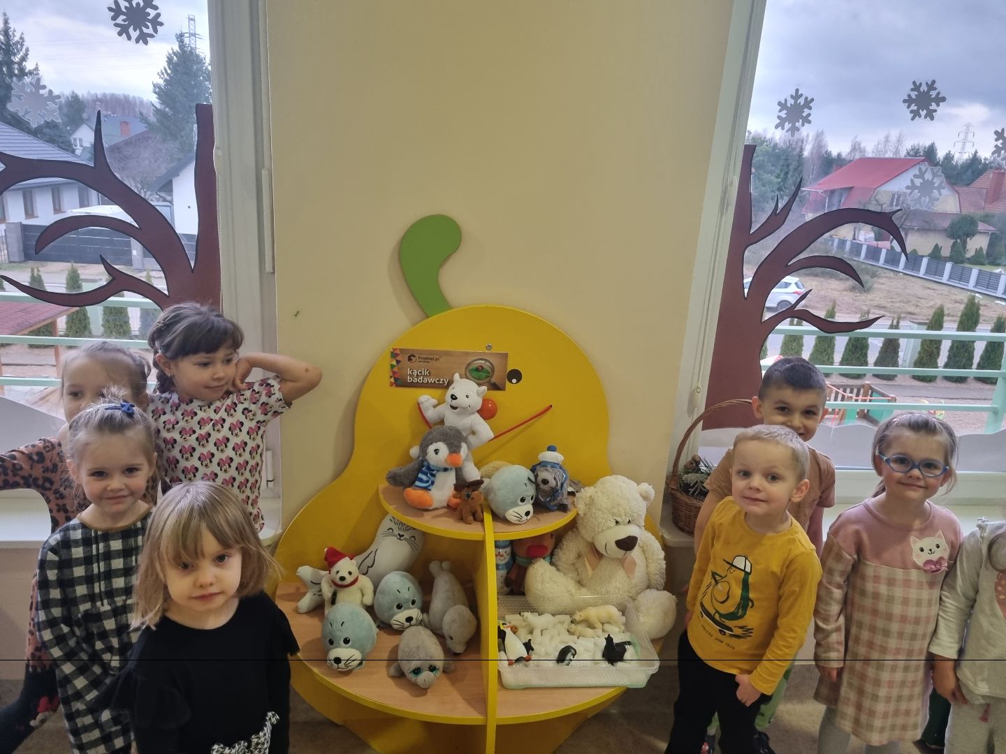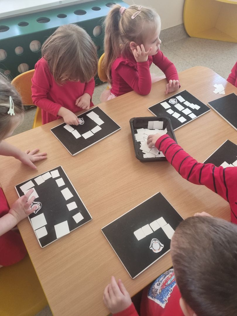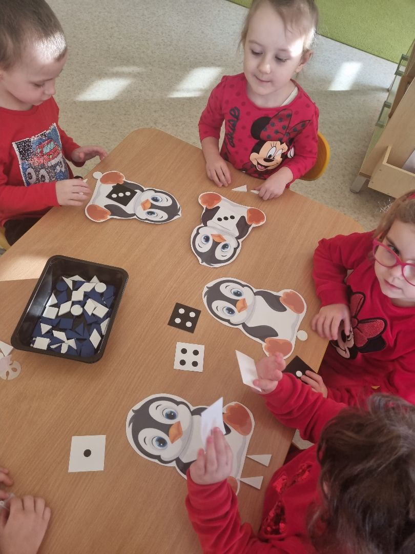Dzieci poznały ludzi i zwierzęta żyjące w lodowej krainie jaką jest Antarktyda. Wiedzą, że pingwiny to ptaki, ale nie latają, a niedźwiedź może być biały bo jest niedźwiedziem polarnym. Nauczyły się wiersza o Eskimosie i piosenki o pingwinie. Doskonale też pracowały we freblowskich kącikach zabawowo-zadaniowych.