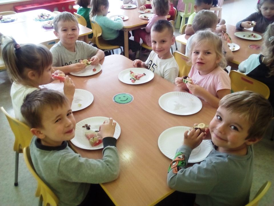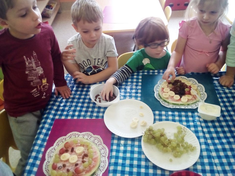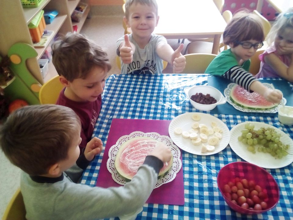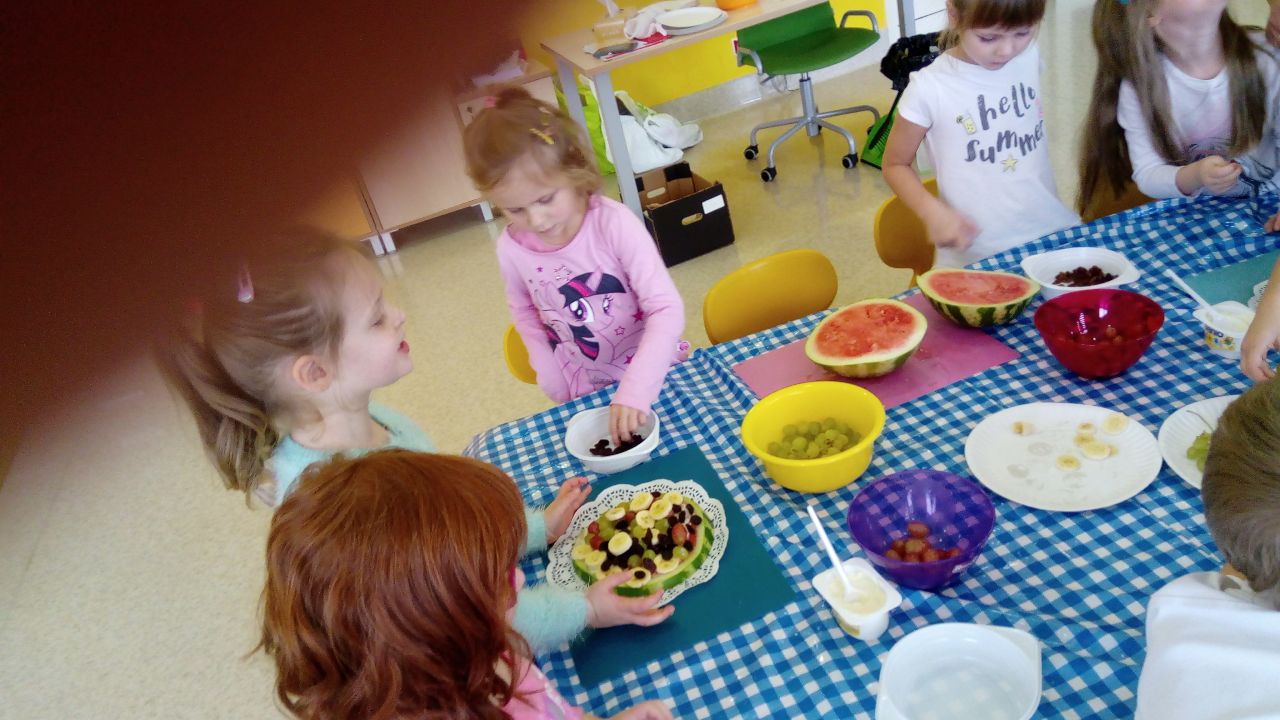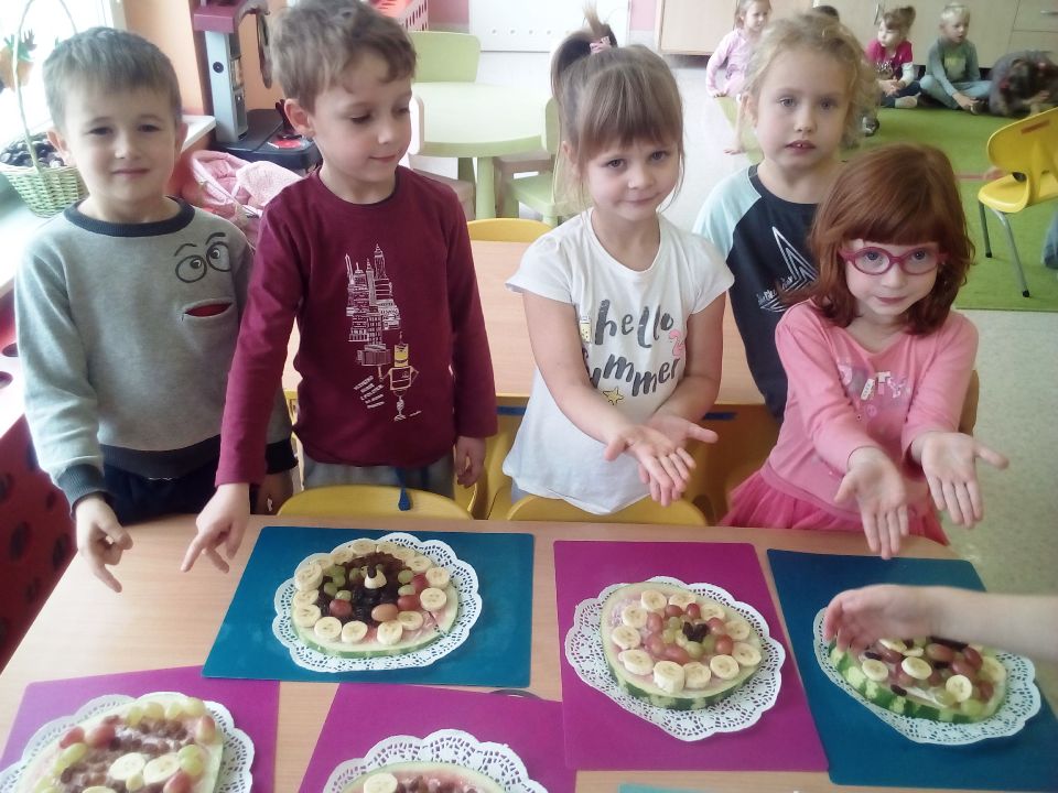 „Mandarynki” w tym dniu wysłuchały bardzo pouczającego wierszyka o Kasi, która jadła duże ilości niezdrowych produktów. Dowiedziały się, jak wielkie znaczenie ma zdrowa dieta, która wcale nie musi być nudna, a tym bardziej niesmaczna! W ramach realizacji programu własnego „Na zdrowie!” wspólne przygotowały zdrową wersję „pizzy arbuzowej”, która ku zaskoczeniu wszystkich dzieci - smakowała wybornie!!! Liczne prośby o dokładki świadczyły o tym, że nasz kulinarny eksperyment zastąpienia fast foodów owocowym deserem się powiódł!!!