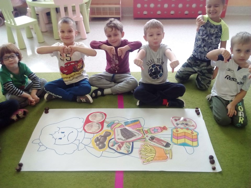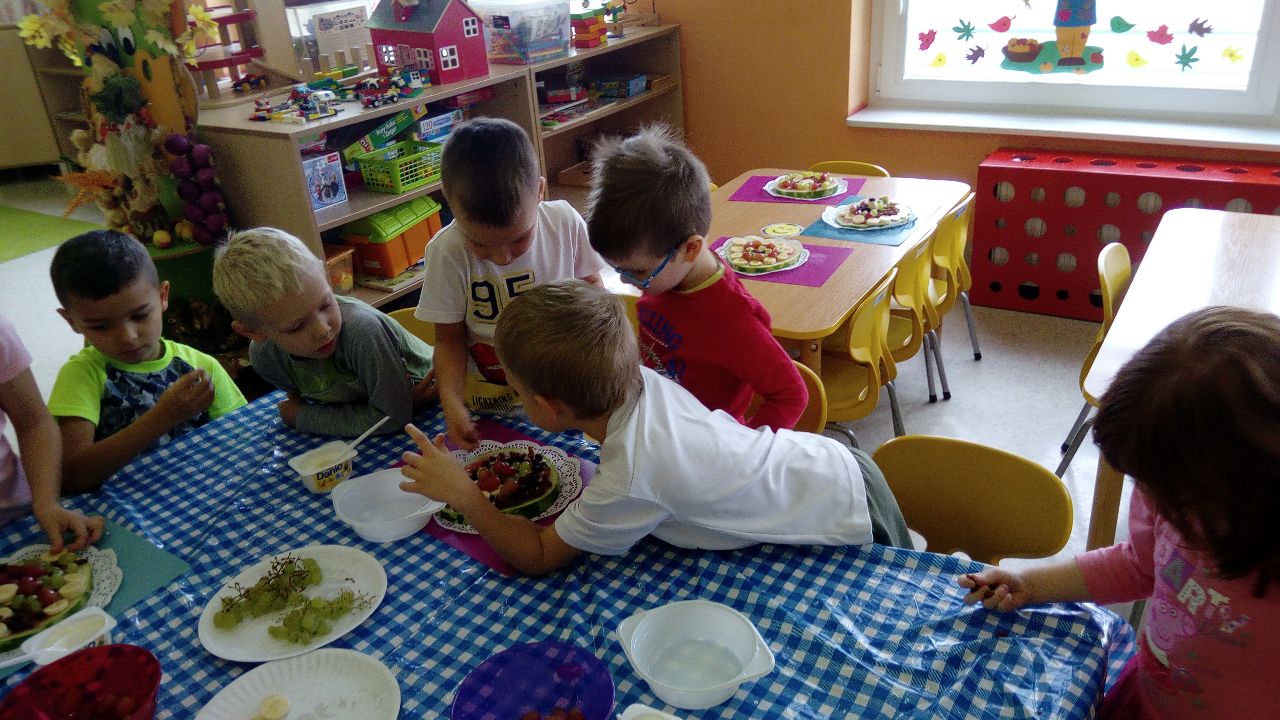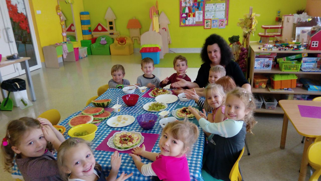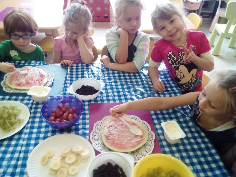 „Mandarynki” w tym dniu wysłuchały bardzo pouczającego wierszyka o Kasi, która jadła duże ilości niezdrowych produktów. Dowiedziały się, jak wielkie znaczenie ma zdrowa dieta, która wcale nie musi być nudna, a tym bardziej niesmaczna! W ramach realizacji programu własnego „Na zdrowie!” wspólne przygotowały zdrową wersję „pizzy arbuzowej”, która ku zaskoczeniu wszystkich dzieci - smakowała wybornie!!! Liczne prośby o dokładki świadczyły o tym, że nasz kulinarny eksperyment zastąpienia fast foodów owocowym deserem się powiódł!!!