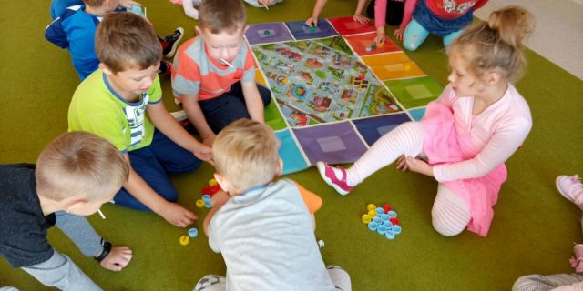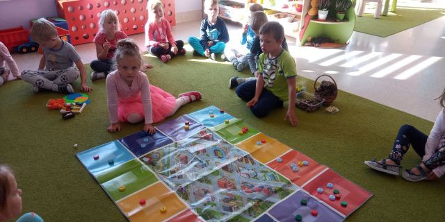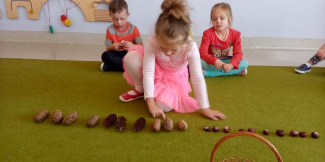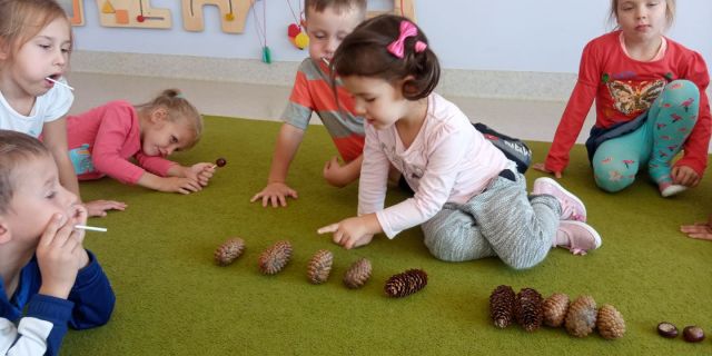 W piątek 27 września Mandarynki miały okazję do jesiennych zabaw z matematyką. Liczyły jesienne dary natury - szyszki, kasztany, żołędzie. Porównywały zbiory kasztanów i szyszek - określały, gdzie jest więcej a gdzie mniej zbiorów. Dzieci grały również w matematyczną grę przestrzenną na planszy edukacyjnej, gdzie poruszały się po polach i przeliczały nakrętki. Mandarynki rozpoznawały i i nazywały też wybrane figury geometryczne - koło i kwadrat. Poznawały ich podstawowe cechy, sposoby dokonywania pomiarów długości i szerokości przedmiotów. Miały też za zadanie wskazać przedmioty w sali w kształcie koła i kwadratu. Rozmawialiśmy też o tym, gdzie możemy spotkać te kształty w życiu codziennym.