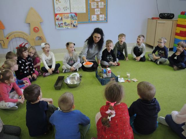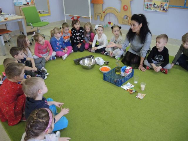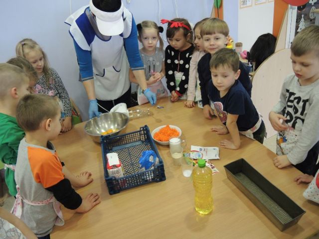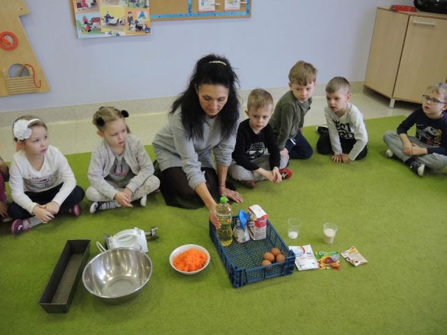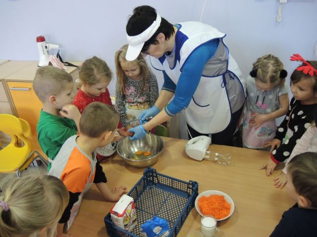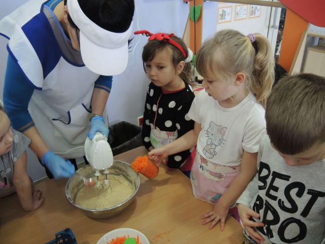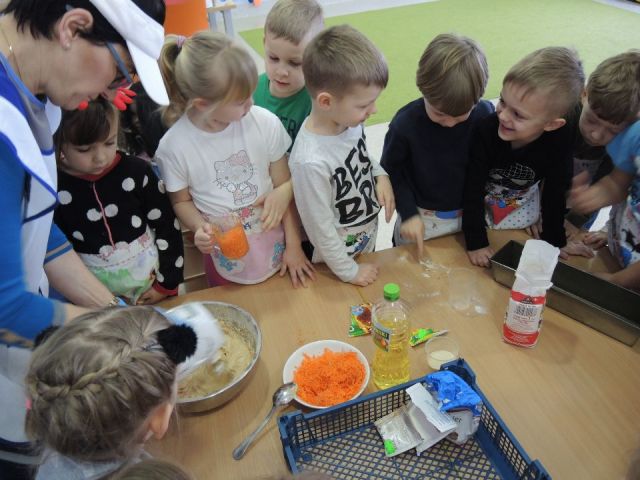 Wszystkie dzieci lubią słodkie "co nie co". Ale słodkie i zdrowe to już przepychota. Dlatego "Mandarynki" postanowiły uhonorować Dzień Ciasta Marchewkowego w swojej grupie. Najpierw utrwaliły wiadomości o zdrowotnych właściwościach marchewki oraz innych produktów spożywczych, a następnie wykonały ciasto marchewkowe. Najlepsze zostało na koniec! Degustacja - mniam!