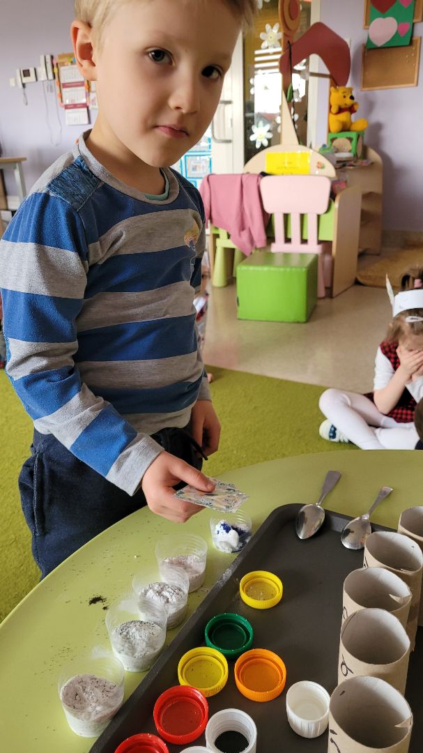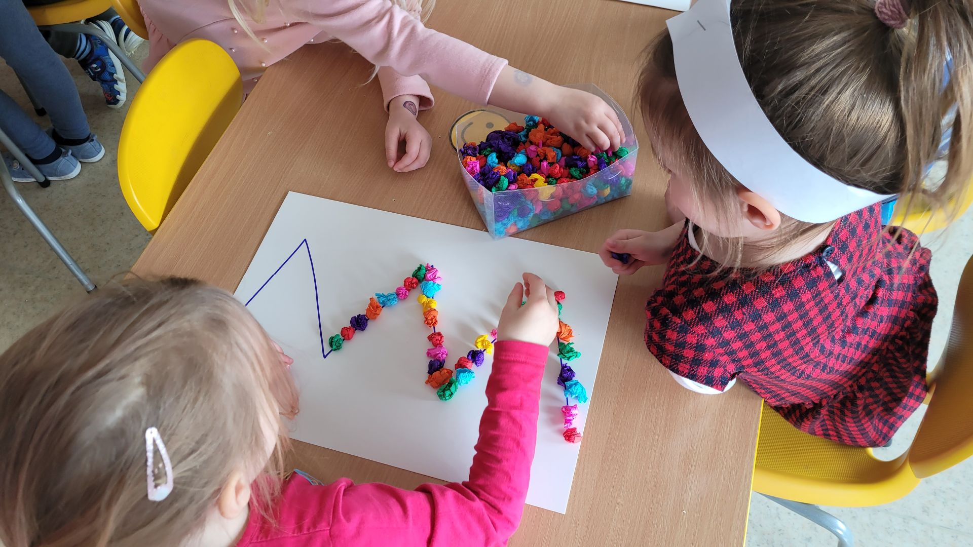 Dzieci na podstawie wiersza „Wiosna” Grażyny Świerczyńskiej za pomocą Darów Froebla zilustrowały wskazany fragment wiersza, tworząc obrazy do usłyszanego tekstu; uczestniczyły w zabawie badawczej „Kolorowy zawrót głowy”; doskonaliły motorykę małą podczas układania „Wiosennych szlaczków”.