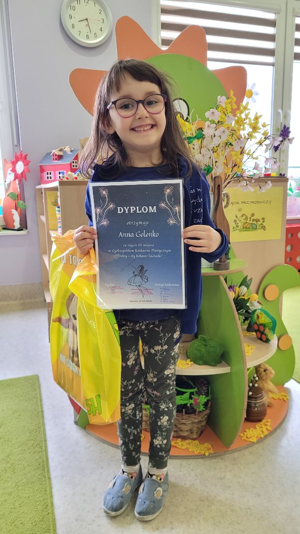 Serdecznie gratulujemy Ani G. z grupy IV „Mandarynki” zdobycia III MIEJSCA w ogólnopolskim konkursie plastycznym pt. "DOBRY I ZŁY BOHATER LITERACKI".