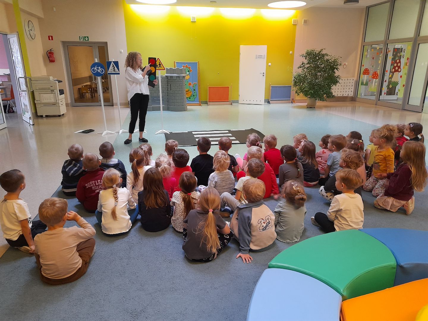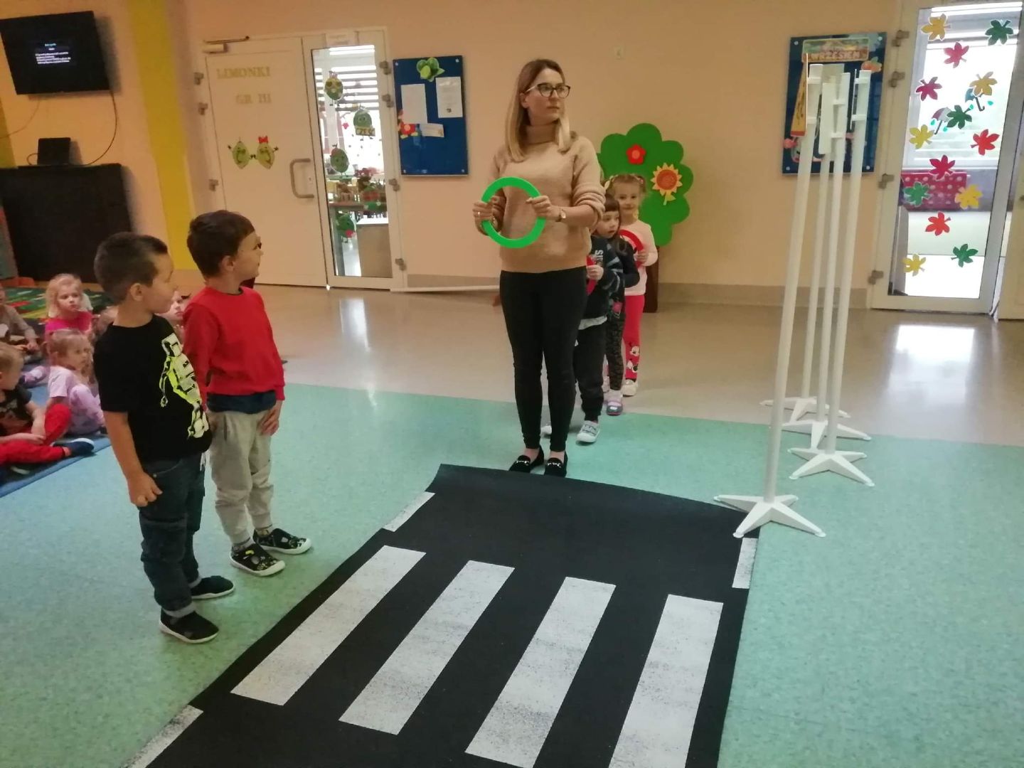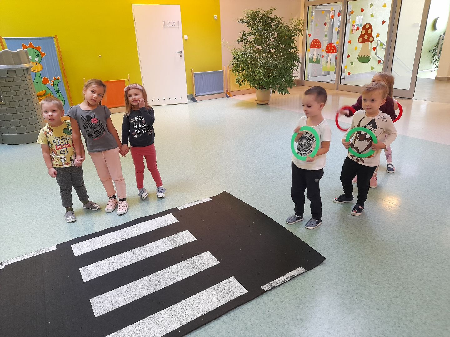 W tym tygodniu "Mandarynki" oraz "Limonki" wspólnie poznały zasady bezpiecznego poruszania się po ulicy z uwzględnieniem przejścia przez pasy. Na początku dzieci obejrzały bajkę edukacyjną pt. "Bezpieczeństwo na drodze" oraz zapoznały się z podstawowymi znakami drogowymi. Po wysłuchaniu prelekcji i wypowiedzi dzieci dotyczących własnych doświadczeń przeszliśmy do działań praktycznych. Następnie "Mandarynki" wykonały sygnalizację świetlną i wspólnie bawiły się w zabawę muzyczno- ruchową "Pojazdy". Dzień zakończył się spacerem z utrwaleniem znaków drogowych i przejścia przez ulicę.