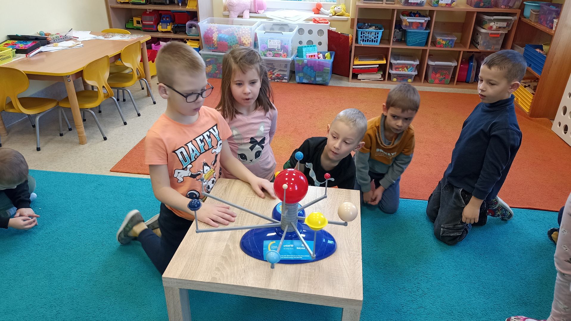 Starszaki z grupy VI ,,Ananasy'' w tym tygodniu wyruszyły w kosmiczną podróż po planetach Układu Słonecznego. Dowiedzieliśmy się wielu cekawostek o planetach, nauczyliśmy się ich nazw i kolejności od Słońca. Wykonaliśmy pracę plastyczną z układem planet wymyślonym przez dzieci oraz wykonaliśmy galaktyczną wyklejankę. Bawiliśmy się z modelem Układu Słonecznego słuchając ciekawych informacji o każdej z planet w języku angielskim. Dzieci dowiedziały się w jaki sposób Mikołaj Kopernik odkrył, że planety krążą wokół Słońca i dlaczego warto bronić swojego zdania.