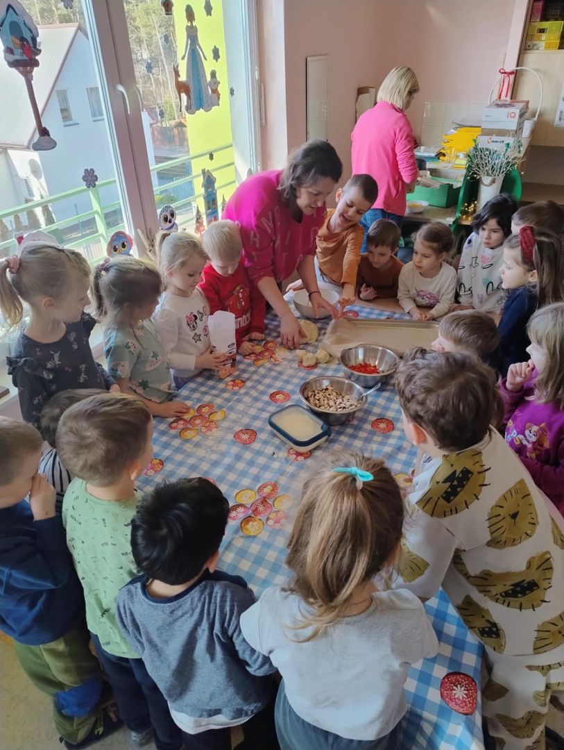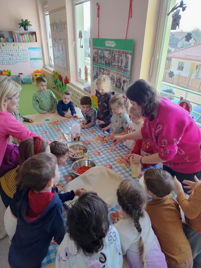Tego dnia sala naszego przedszkola zamieniła się we włoska pizzerię. Dzieci poznały historie pizzy, dowiedziały się z jakiego kraju ona pochodzi. Była to doskonała okazja by pogłębić wiedzę na temat różnorodności w świecie sztuki kulinarnej. W dalszej części przedszkolaki wymieniały składniki, które potrzebne są przyrządzenia tego przepysznego dania oraz tańczyły do piosenki, w której główną rolę odegrała pizza. Nasi mali smakosze miały okazję wcielić się we włoskich kucharzy tworząc własne kompozycje pizzy. Wielką frajdę sprawiło naszym dzieciom formowanie „drożdżowych placków”, smarowanie sosem pomidorowym, nakładanie ulubionych składników oraz dużej ilości sera. Gdy pizze były już gotowe, powędrowały do rozgrzanego pieca. Dzieci cierpliwe czekały na degustacje samodzielnie przygotowanego dania....MNIAM MNIAM. Dzień upłynął nam w smakowitej i ciepłej atmosferze.