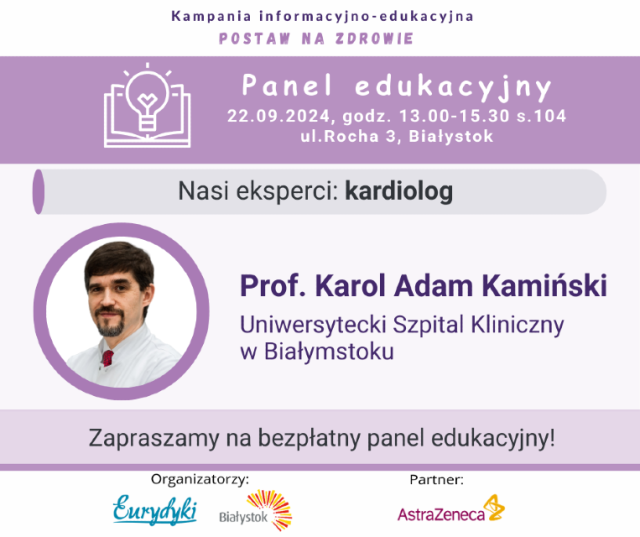 Miasto Białystok wraz ze Stowarzyszeniem Eurydyki organizuje pod patronatem Prezydenta Miasta kampanię informacyjno - edukacyjną Postaw na zdrowie. W najbliższą niedzielę tj. 22 września br. Panel poświęcony będzie chorobom układu krążenia a gościem będzie prof. dr hab. n. med. Karol Adam Kamiński -kardiolog, prorektor ds. medycyny prewencyjnej i otwartej nauki Uniwersytetu Medycznego w Białymstoku.