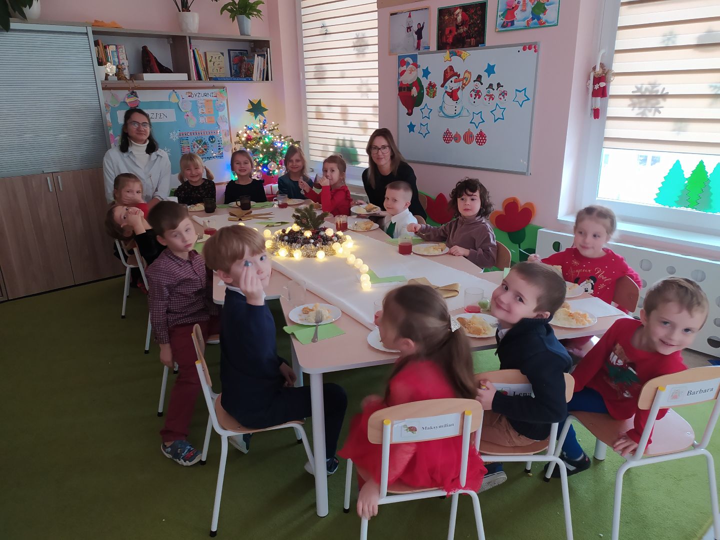 W piątek, 22 grudnia 2023 odbyły się w naszym przedszkolu Wigilie w poszczególnych grupach. Święta Bożego Narodzenia to magiczny czas. Dla wielu z nas jest to dzień niezwykle radosny , spędzony w gronie najbliższych. Czekamy na pierwszą gwiazdkę, dzielimy się opłatkiem, składamy sobie życzenia, śpiewamy kolędy, jemy świąteczne potrawy. Także w naszym przedszkolu nastał wspaniały moment- Wigilia, Boże Narodzenie! Dzieci wspólnie z Paniami kolędowały, składały sobie życzenia i jadły wspólny świąteczny obiad przy pięknie udekorowanym stole. Takie podniosłe chwile nie tylko utrwalają dzieciom znajomość tradycji i zwyczajów świątecznych lecz również, co najważniejsze wzmacniają bliskie serdeczne relacje. Wesołych Świąt!