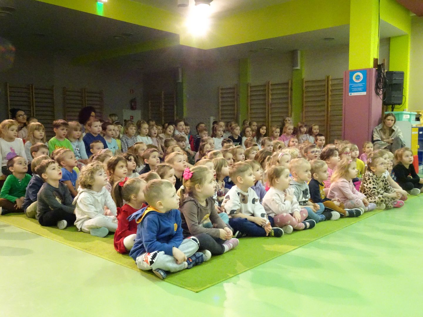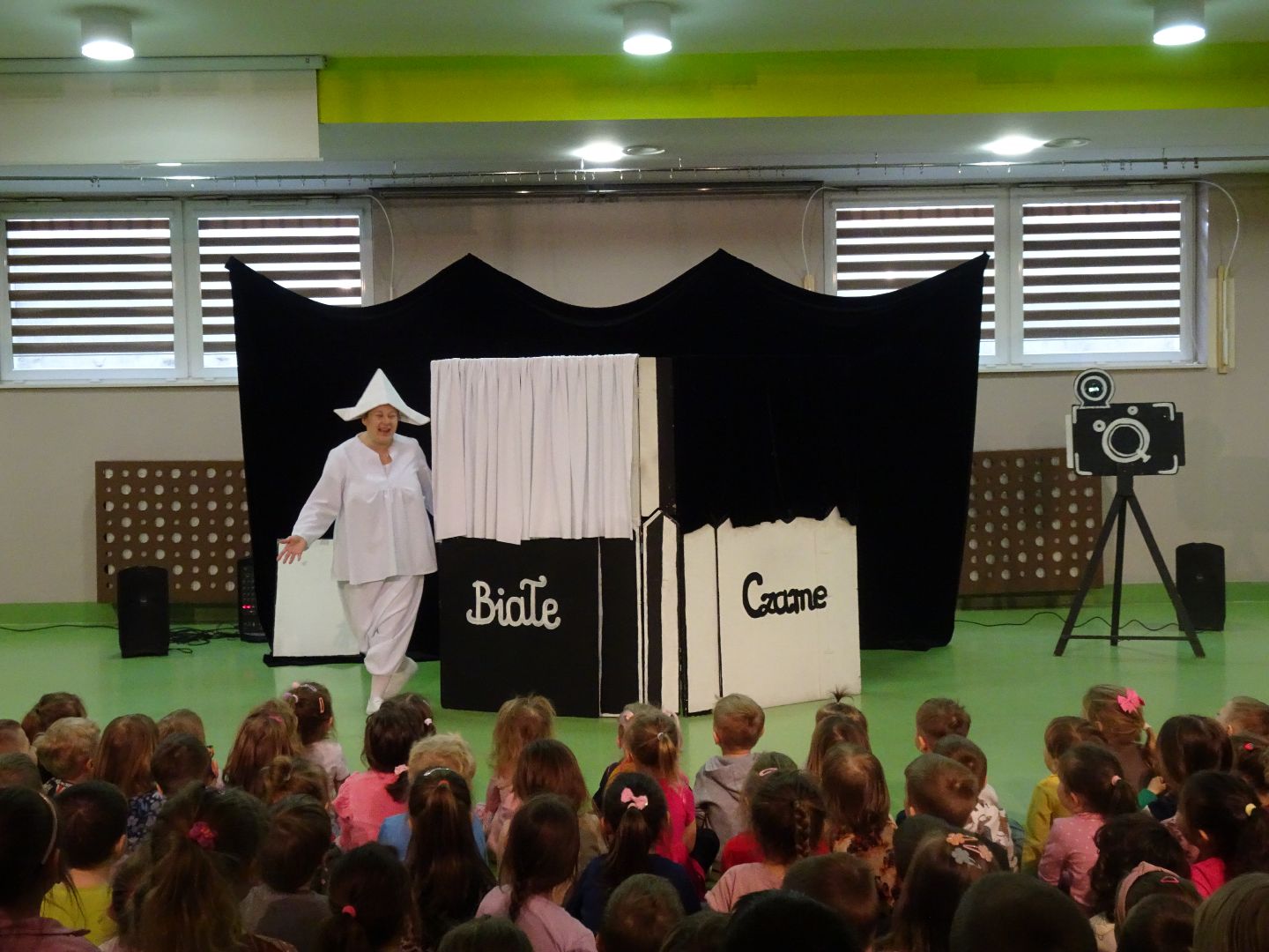 1 marca 2024 r. aktorzy ,,Teatru Pod Orzełkiem'' zabrali małych widzów do czarno - białego miasteczka. Podczas spektaklu Poeta Pan Czarny i Malarka Pani Biała tworzą książkę o przygodach m. in. Czarnego i Białego Kota, Sroki Kłamczuchy, Białego Kruka, Białego Niedźwiedzia. Ponadto obserwują czarno - białe zjawiska z otaczającej rzeczywistości. Atrakcją spektaklu były płaskie lalki przypominające figury wycięte z kart książki. Dziękujemy za wspaniałe widowisko.