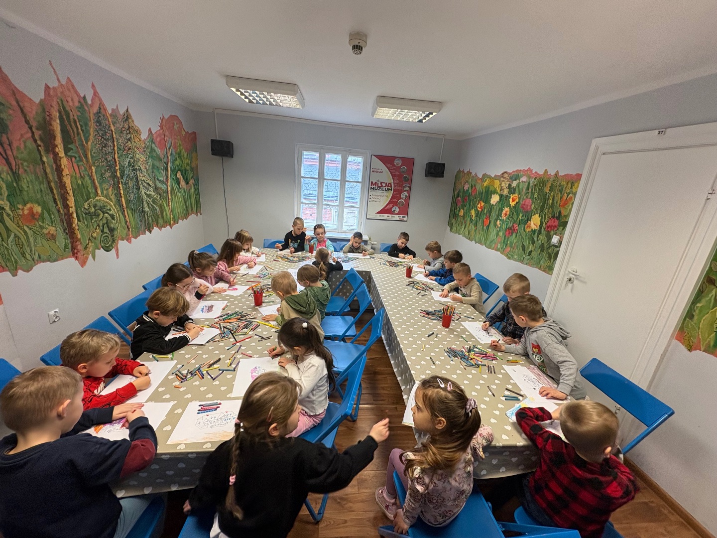 Na koniec wizyty każde dziecko wykonało pocztówkę z Muzeum Rzeźby Alfonsa Karnego,