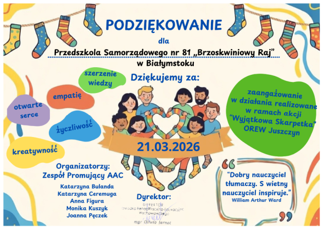 - Podziękowanie za udział w akcji ,,Wyjątkowa skarpetka'' OREW Juszczyn w ramach obchodów Światowego Dnia Autyzmu