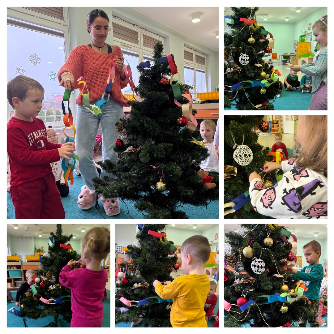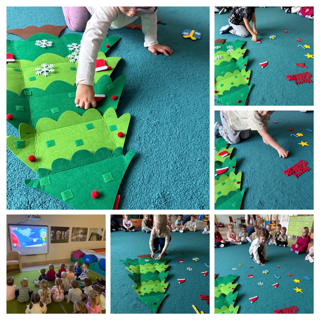 W tym czasie wspólnie przygotowywaliśmy się do Świąt Bożego Narodzenia. Dzieci przyniosły z domu własne bombki i z wielką radością ubierały przedszkolną choinkę. Odbyły się również zajęcia z wykorzystaniem filcowej choinki, podczas których dzieci rozpoznawały i nazywały ozdoby świąteczne. Zajęcia te połączone były z elementami matematyki – przedszkolaki liczyły ozdoby, porównywały ich ilość oraz przypinały je w odpowiednich miejscach na choince.