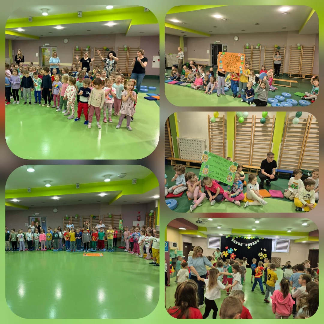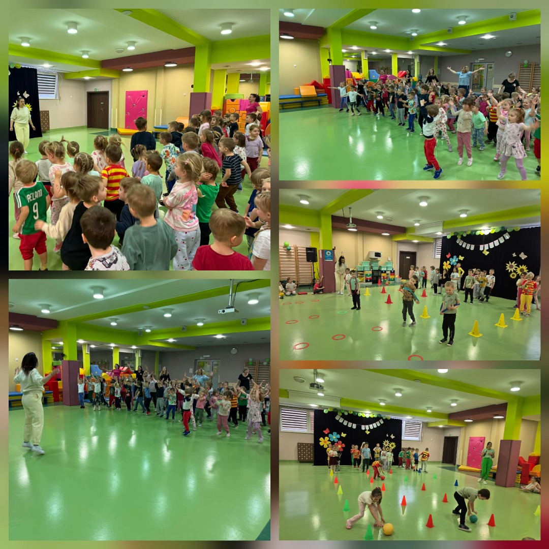 Wiosenna Olimpijka przedszkolna odbyła się w sali wielofunkcyjnej ze względu na niesprzyjające warunki pogodowe. Uroczystość została podzielona na dwie części – dla grup młodszych oraz starszych, co pozwoliło dostosować aktywności do możliwości dzieci.