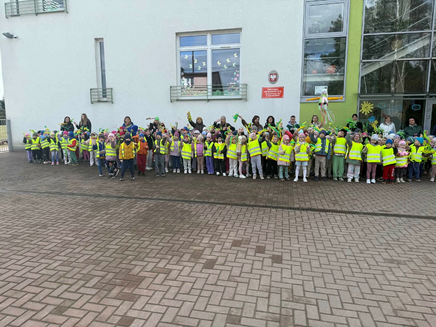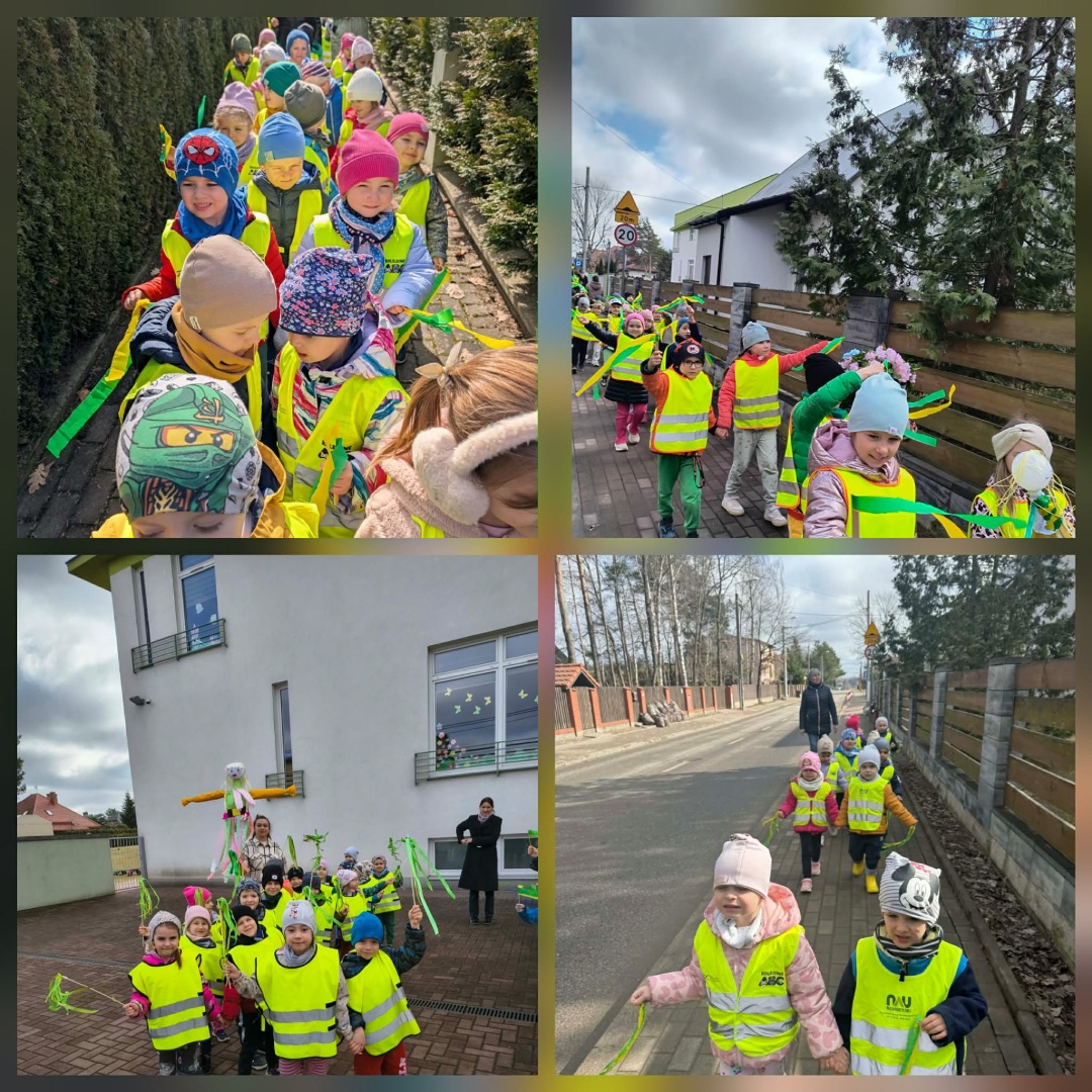 Po zakończeniu części sportowej odbył się pochód z Marzanną w okolicy przedszkola. W trakcie śpiewania wiosennych piosenek zza chmur wyszło słońce, dzięki czemu towarzyszyły nam idealne warunki do wspólnego świętowania. Dzieci poznały tradycję pożegnania zimy, maszerowały, machając kolorowymi wstążkami, a na zakończenie symbolicznie pożegnały Marzannę.