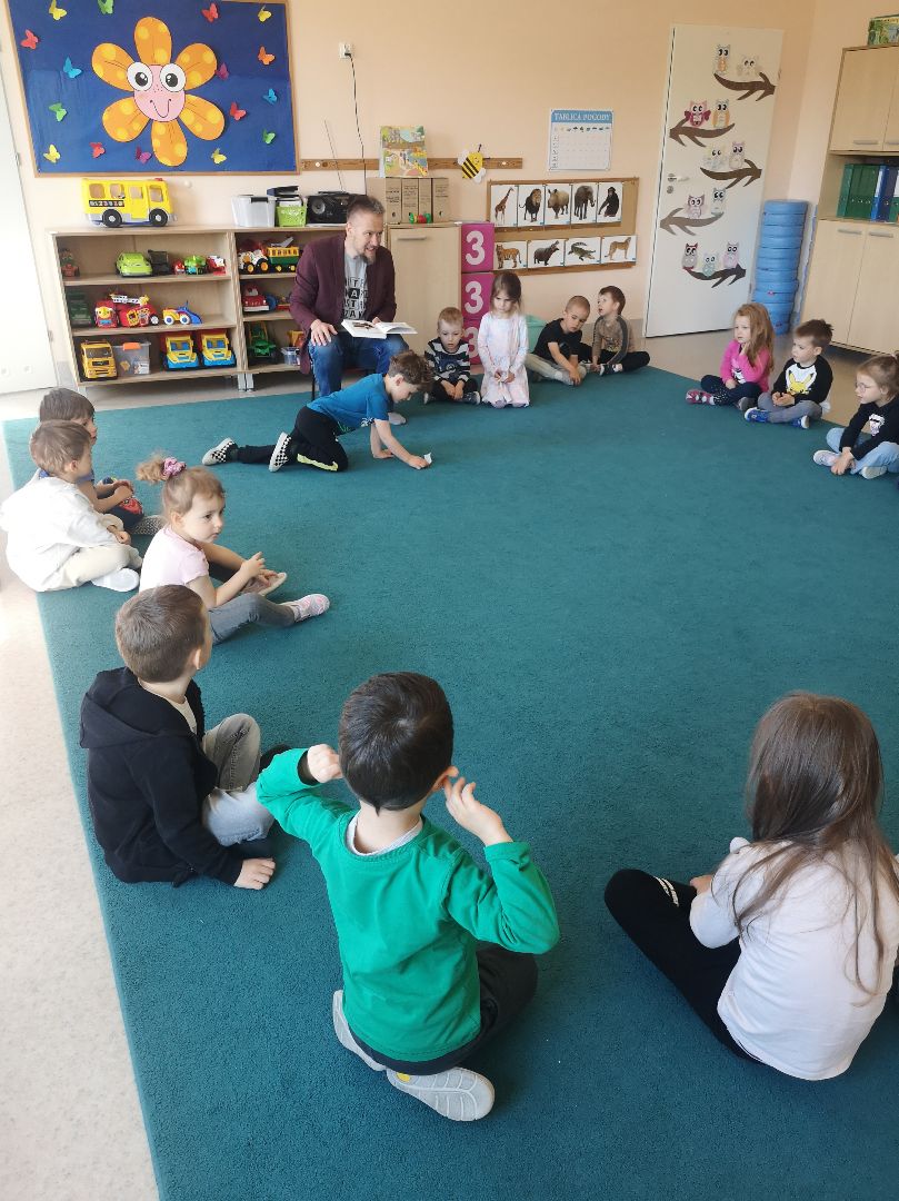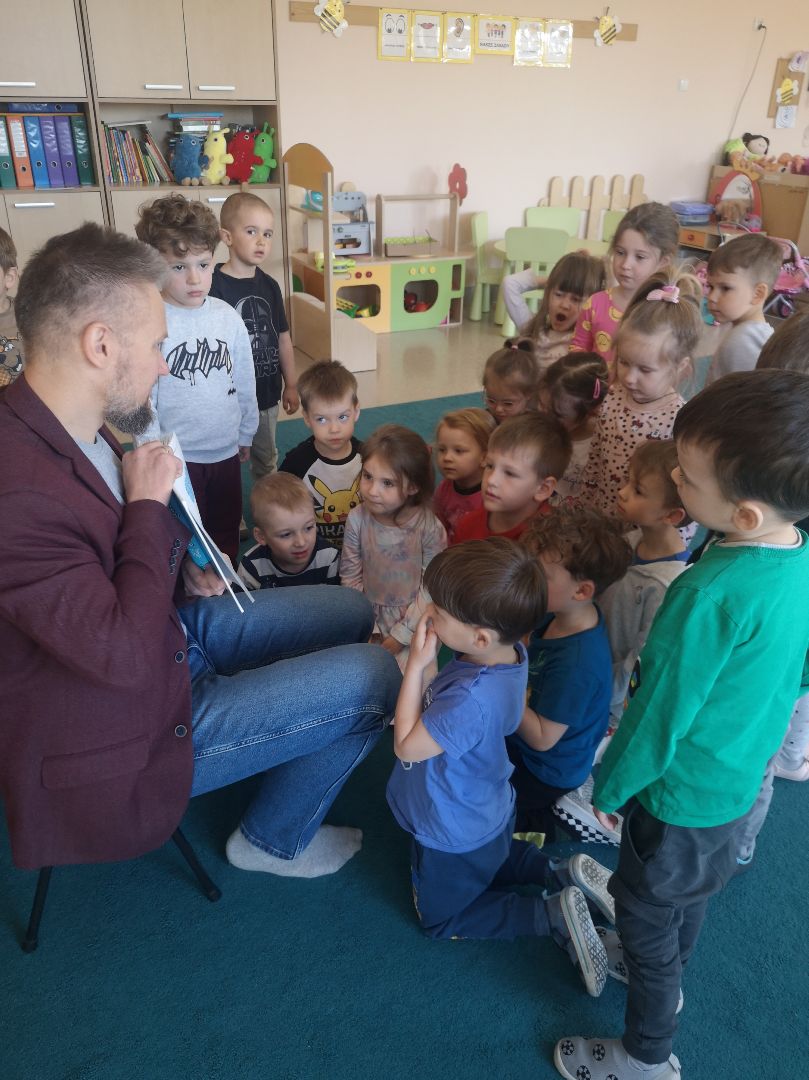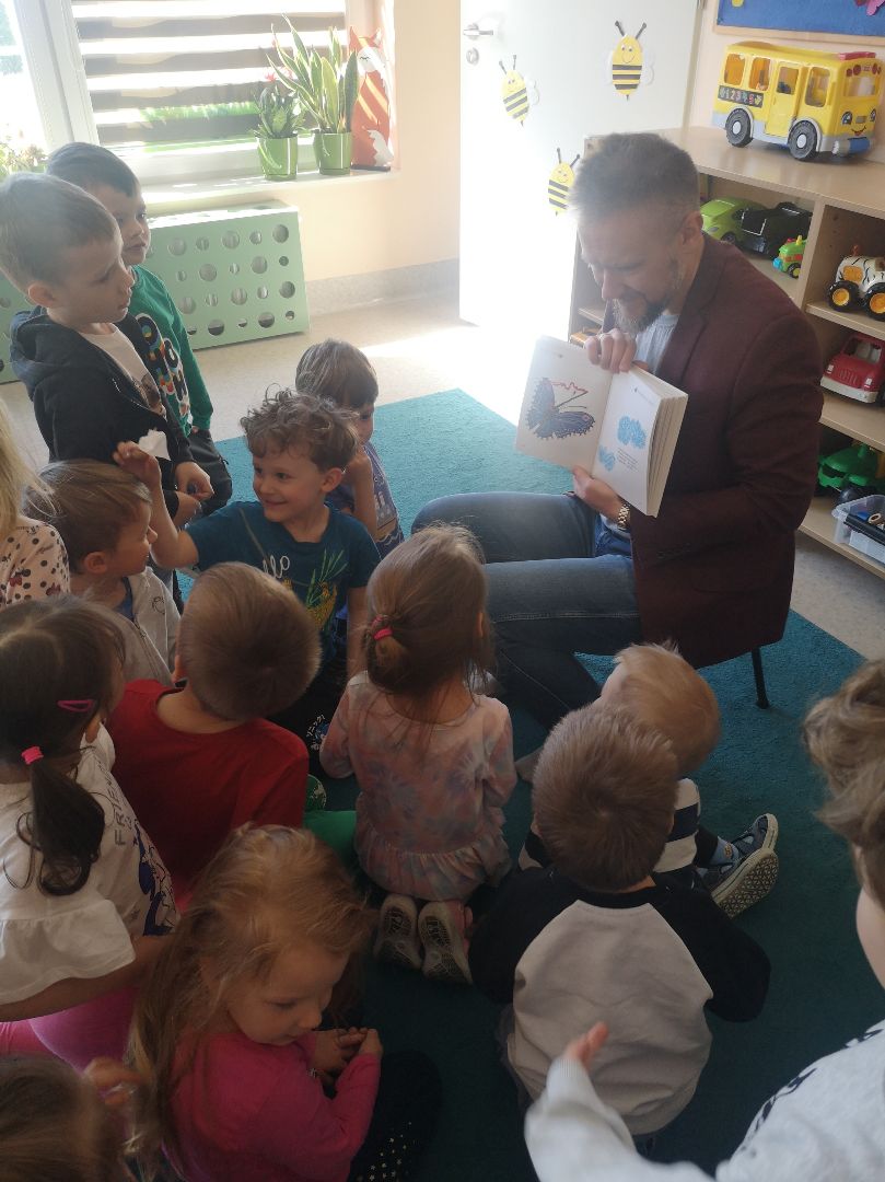 W środę 7 maja naszą grupę odwiedził tata Adasia, pan Przemek, który przeczytał dzieciom wiersz J. Tuwima pt.: „Pan Maluśkiewicz i wieloryb”. Wszyscy z wielkim zainteresowaniem słuchali opowieści o małym i odważnym podróżniku, który wyruszył w nieznane by zobaczyć wieloryba. Wiersz, pełen humoru i fantazji bardzo spodobał się przedszkolakom. Po wspólnym czytaniu dzieci miały okazję porozmawiać o podróżach i morskich przygodach. Było to bardzo ciekawe i inspirujące wydarzenie, które pokazało, jak ważne i przyjemne może być wspólne czytanie.