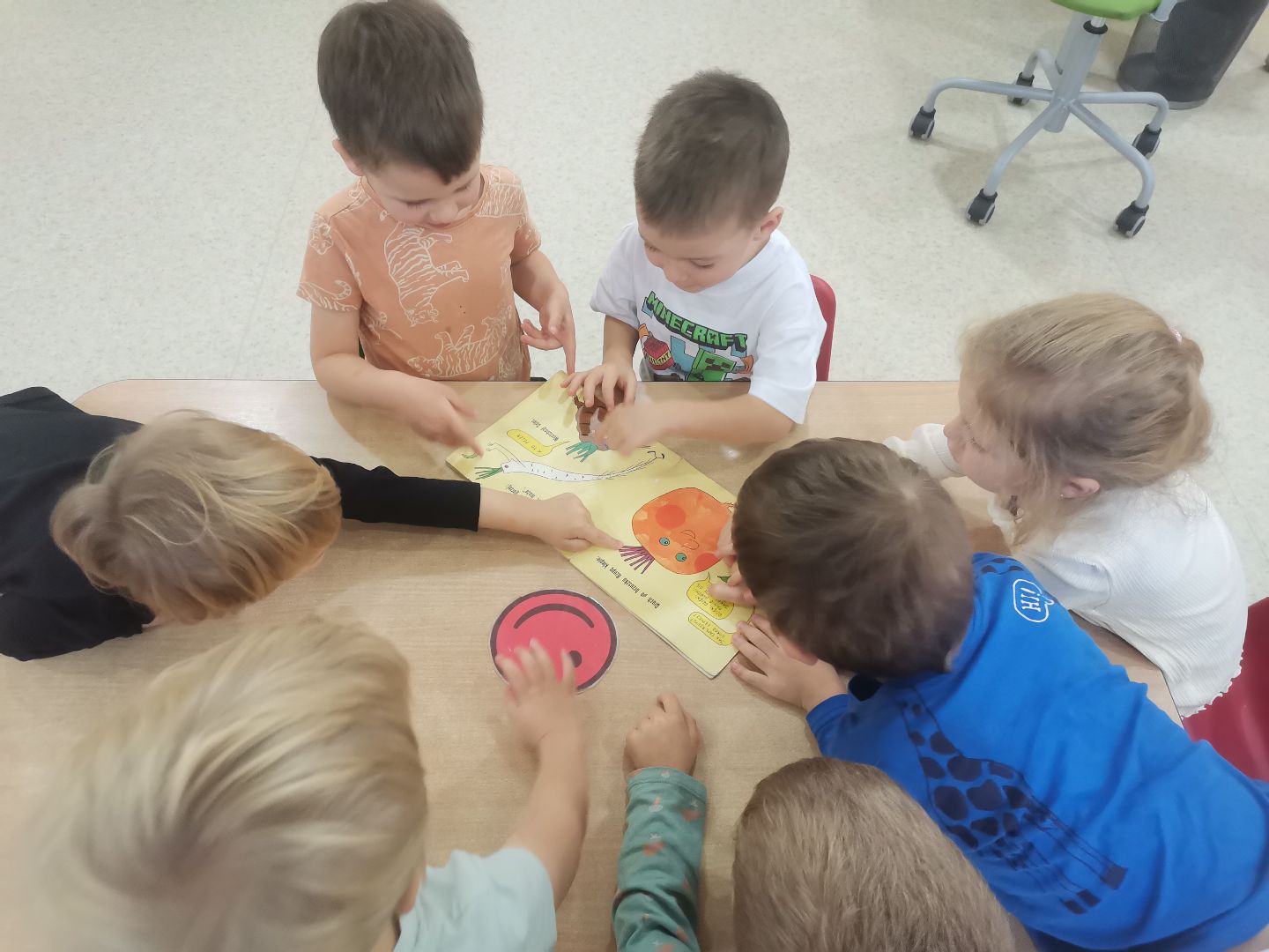 Po lekturze przedszkolaki chętnie opowiadały, która postać najbardziej je rozbawiła i które głosy zrobiły na nich największe wrażenie. Rozmowie towarzyszyło dużo śmiechu i spontanicznych komentarzy.