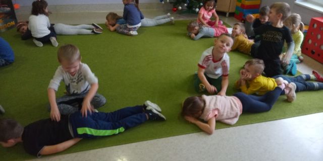 ,,Mandarynki'' bawiły się w ,,Lustro'', a więc starały się wykonywać takie same ruchy jak kolega, ,,Koncert gry na plecach'' - grały paluszkami na plecach drugiej osoby. Wiele zabawy było przy ćwiczeniu ,,Naleśniki'', czyli turlaniu się. W ,,Przepychankach'' dzieci plecami musiały przesunąć swojego partnera w zabawie. Najbardziej spodobała się dzieciom zabawa w ,,Ślepca'', która wymaga wiele zaufania do drugiej osoby, jak i odpowiedzialności od dzieci prowadzących za rękę osoby z zamkniętymi oczami.