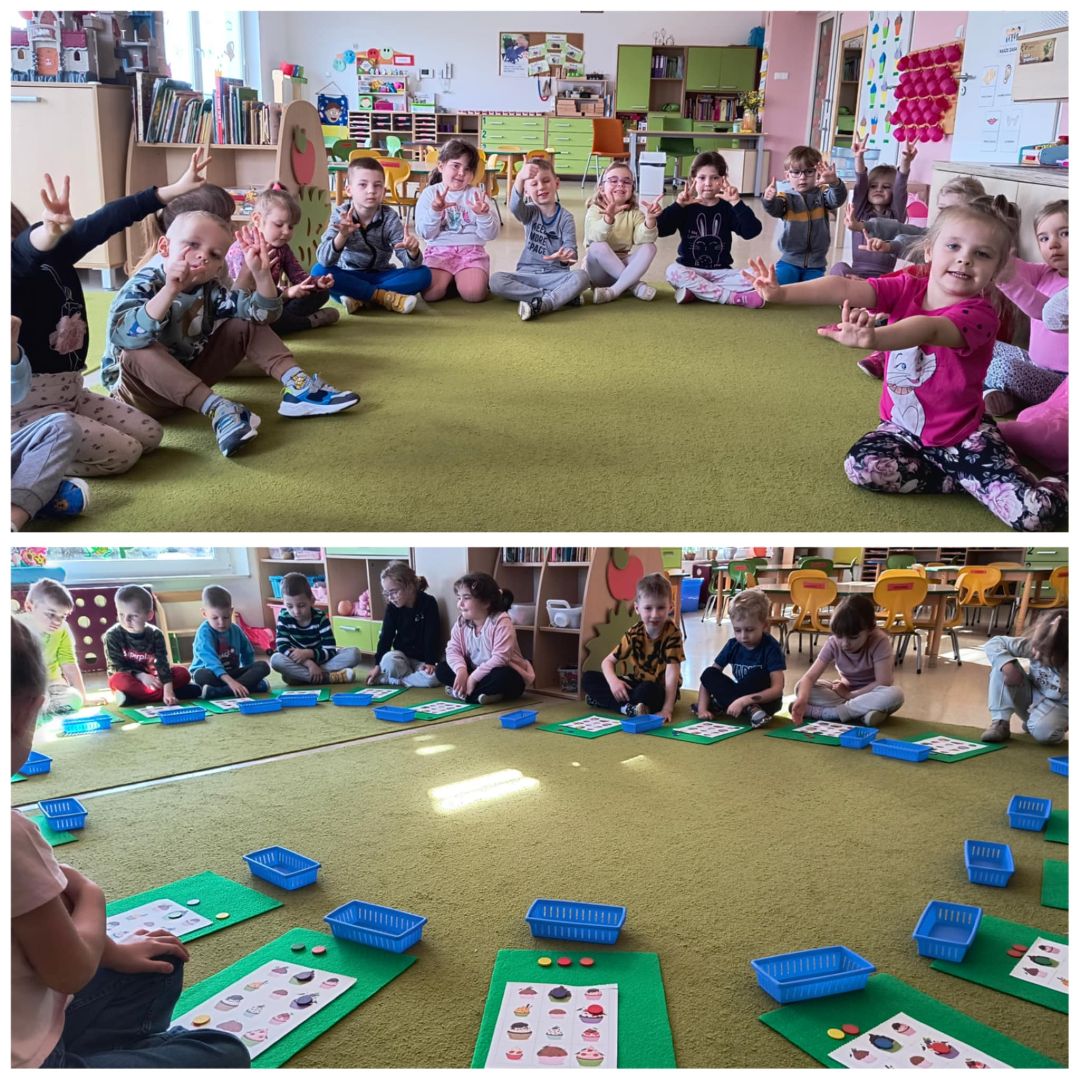 Dzieci uczestniczyły  w zabawie matematycznej, rozpoznając  muffinki widoczne na kartach  ze względu na określone cechy. Zabawa miała rozwijać spostrzegawczość, koncentrację uwagi oraz umiejętność klasyfikacji.