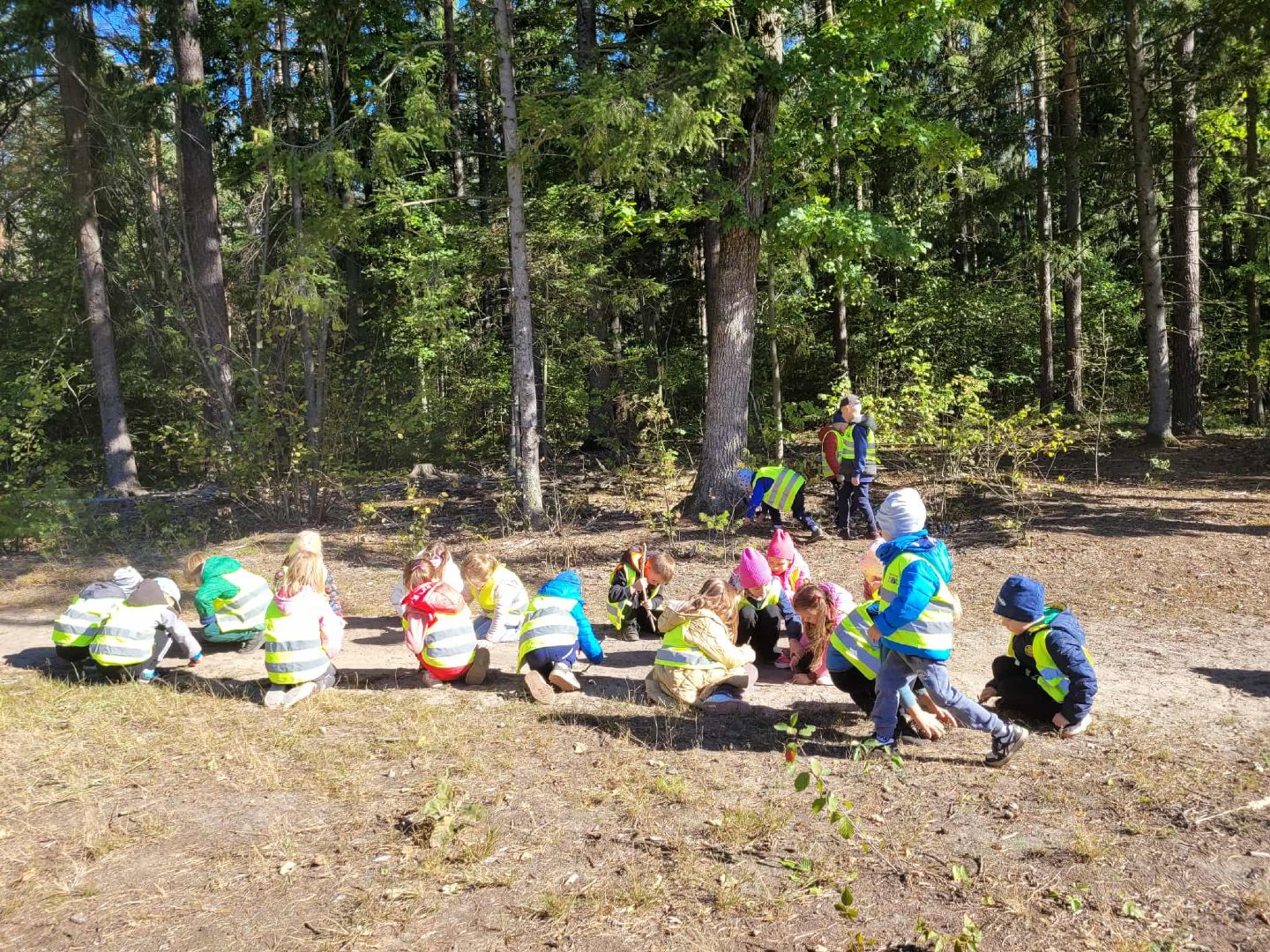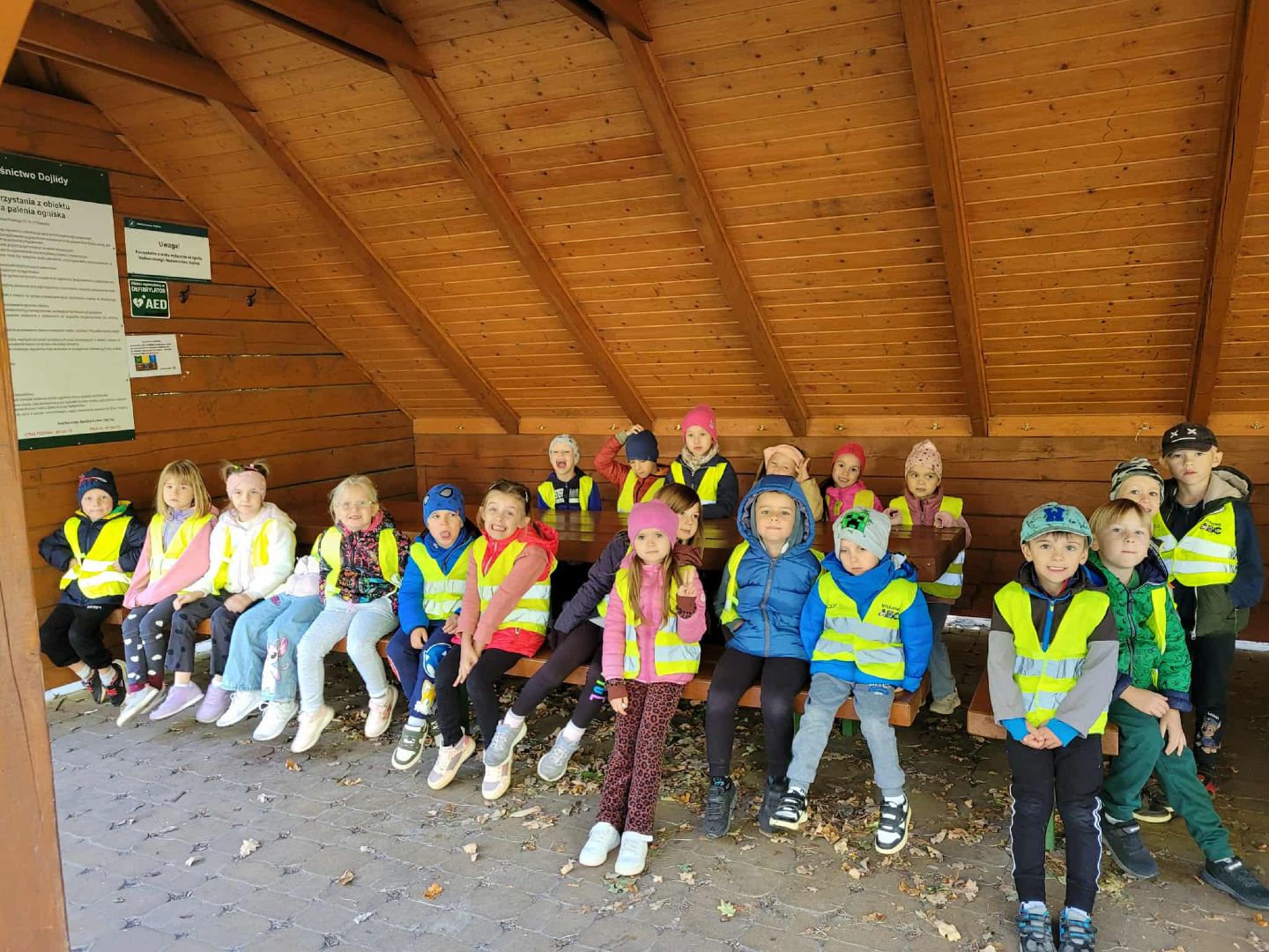 Tego dnia wraz z grupą Poziomki wybraliśmy się do Nadleśnictwa Dojlidy. Na miejscu bardzo ciepło przyjęła nas  specjalistka od edukacji leśnej Pani Maria Stypułkowska. Gospodarz spotkania wzięła nas pod swoje skrzydła, prowadząc prelekcje na temat „ Drewno jako materiał organiczny. Właściwości drewna, wykorzystanie w przemyśle i w życiu codziennym”. Zajęcia było bardzo ciekawe, ponieważ odbywały się podczas godzinnego, spokojnego spaceru po lesie. Dzieci mogły oglądać gatunki drzew, poznawać ich zastosowanie w przemyśle. Ponadto poznaliśmy oznaczenie oraz właściwości  „drzew ekologicznych” a następnie liczyliśmy ilość tych drzew występujących na naszej trasie wycieczki. Dowiedzieliśmy się jak oznaczona  jest droga pożarowa, który uchronić może nas przed niebezpieczeństwem oraz odpowiadaliśmy na pytania, czego nie można robić w lesie. Na naszej drodze znalazło się również  drzewo z odkrytymi korzeniami, dzięki czemu widzieliśmy przekrój drzewa w jego naturalnej postaci. Pani Maria chcąc abyśmy złapali chwile wytchnienia zaprowadziła nas na  słoneczną polną, abyśmy mogli napić się wody, zjeść wspólnie przekąski,  które zabraliśmy ze sobą do plecaka. Gdy wszyscy nabraliśmy sił  i energii nasz przewodnik zaproponował nam zabawę. Cała grupa naszego dzisiejszego spotkania podzielona była na podgrupy, które miały za zadanie narysować kijem po piasku zwierzątko oraz z dostępnych zasobów leśnych( szyszki, igiełki, patyki, kamyki ułożyć kontury tych zwierząt. To nie był koniec atrakcji. Pani Maria rozdała naszym przedszkolakiem lupy, przez które mogły obserwować liście drzew, korę drzew, owady. Na koniec spotkania podziękowaliśmy  Pani specjalistce za poświęcony dla nas czas. Wróciliśmy się do przedszkola z super nastrojami oraz nowym zasobem  wiedzy. To było fantastyczny dzień.