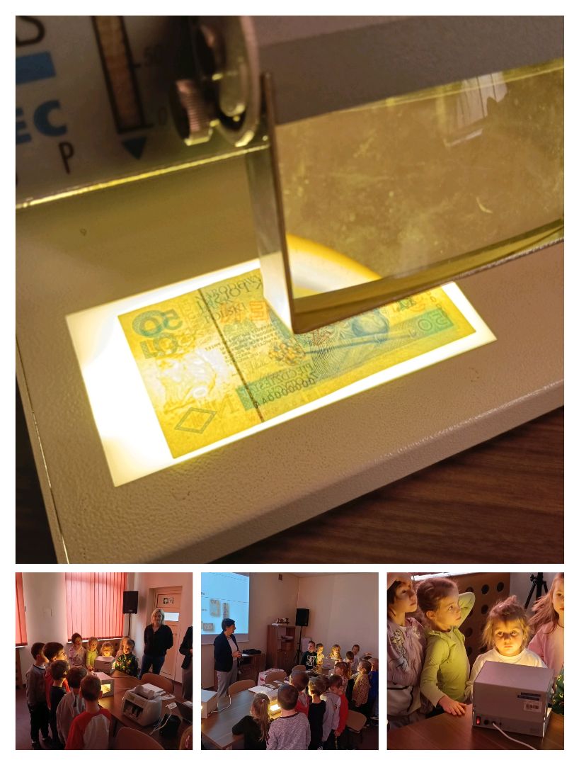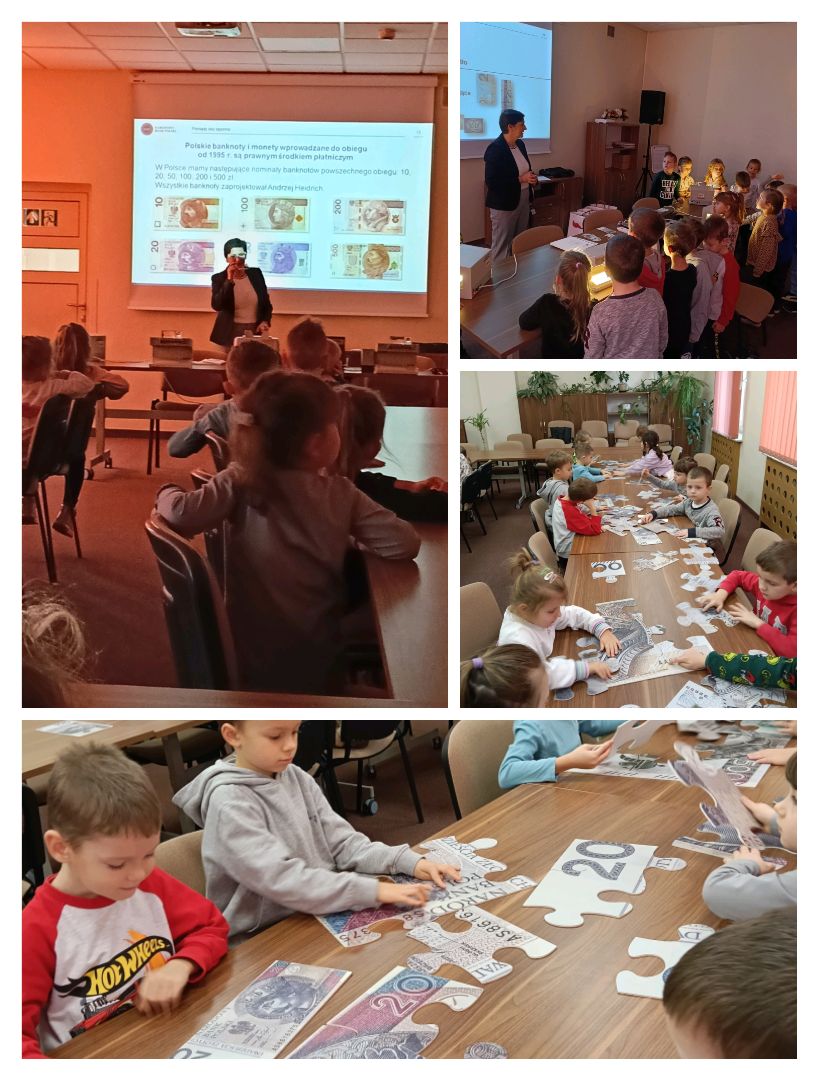 W czasie zajęć przypominaliśmy sobie jaka waluta obowiązuje w naszym kraju, skąd się bierze pieniądz, czy jest nam potrzebny. Poznaliśmy podstawowe zabezpieczenia polskich banknotów wykorzystując przy tym specjalne urządzenie emitujące światło UV. Mieliśmy okazje oglądać kolekcjonerskie banknoty, projektowane przez znakomitych grafików, które zrobiły na nas ogromne wrażenie. Po części pokazowej Pani Ida zaproponowała nam zabawę. Zostaliśmy podzieleni na grupy. Każda z nich miała za zadanie jak najszybsze ułożenie puzzli, na których widniał banknot. Było przy tym dużo śmiechu i radości. Na koniec mieliśmy okazje zaprojektować za pomocą kredek, mazaków, pieczątek własne monety, banknoty. Podczas warsztatów byliśmy bardzo aktywni, dlatego Pani Ida w nagrodę zaprowadziła nas do swojego pokoju, w którym stał ogromny sejf, każdy z nas miał okazje obejrzeć go z bliska. To było bardzo ciekawe spotkanie, które uświadomiło nam rolę banku oraz zwiększyło naszą świadomość na temat pieniądza. Dziękujemy.