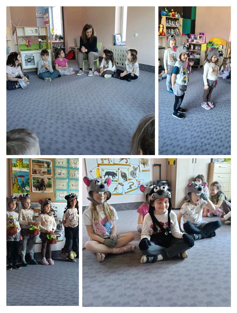 Dalsza część spotkania miała charakter zabaw z wierszami  połączonych z  muzyką i ruchem. Podczas zabaw z pantomimą, mieliśmy okazję wykazać  się zdolnościami aktorskimi wcielając się w role kota i myszy. Podczas tej zabawy było nie tylko dużo śmiechu,  ale była to również okazja do uczenia się i rozumienia własnych i cudzych emocji. 👏👏👏