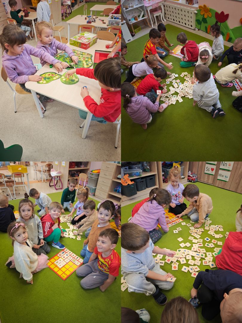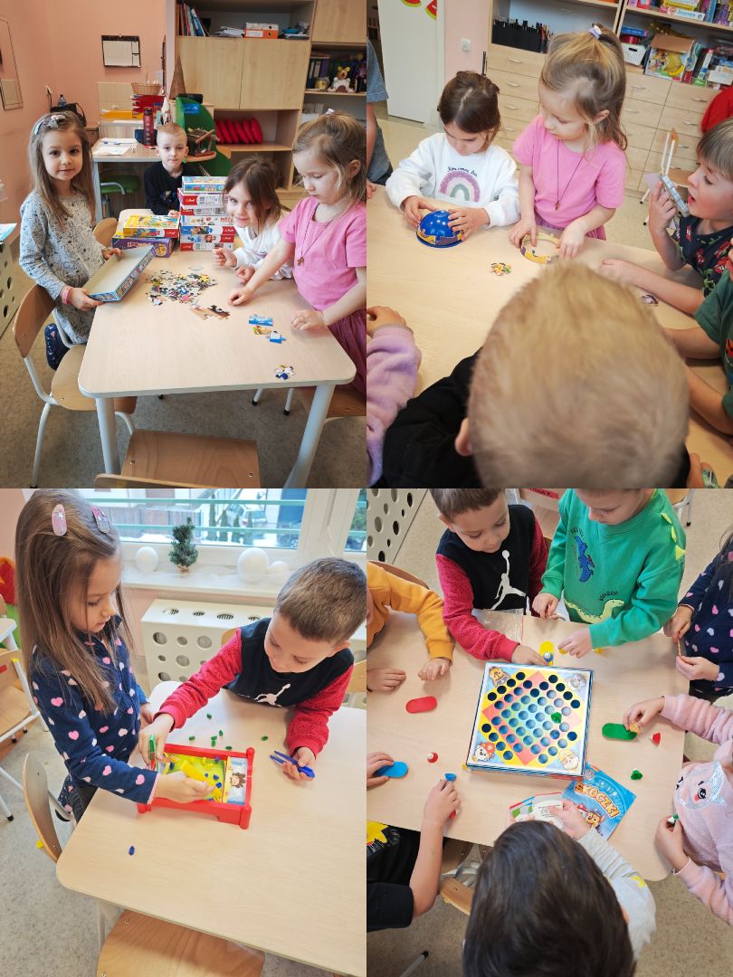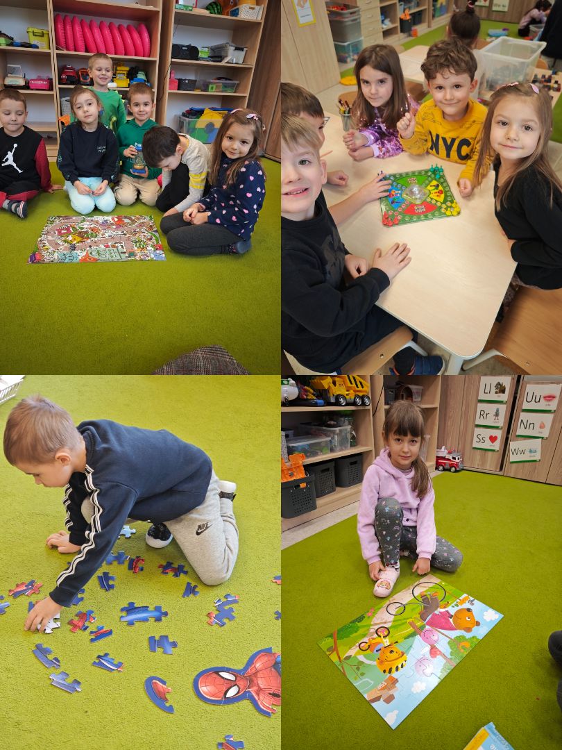 Podczas realizacji bloku "W świecie figur geometrycznych" dzieci przez cały tydzień mogły przynosić gry planszowe, które wykorzystano podczas zabaw dydaktycznych i swobodnych. Przedszkolaki poznawały i utrwalały figury geometryczne podczas zabaw z Logigramem, wyszukiwały je w otoczeniu, klasyfikowały oraz tworzyły kompozycje z kształtów. Tydzień zakończył się obchodami "Międzynarodowego Dnia Puzzli", podczas których dzieci układały puzzle o różnym stopniu trudności, rozwijając koncentrację, spostrzegawczość i logiczne myślenie.