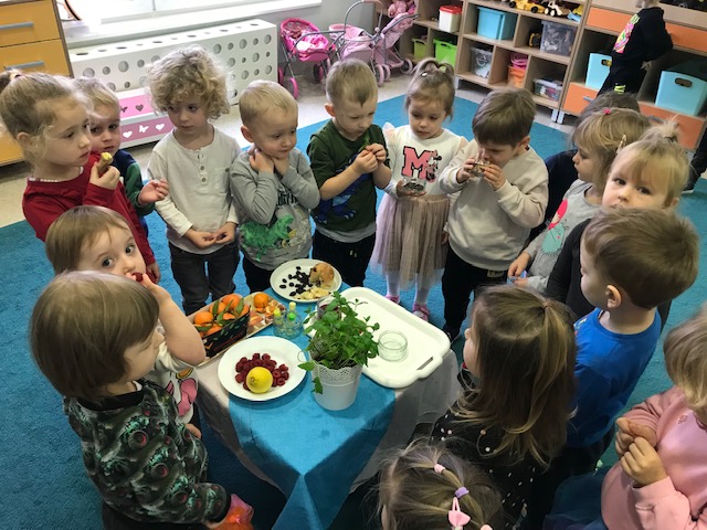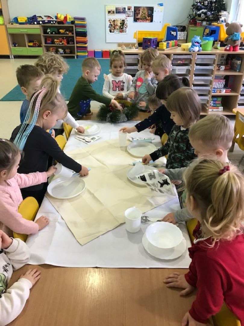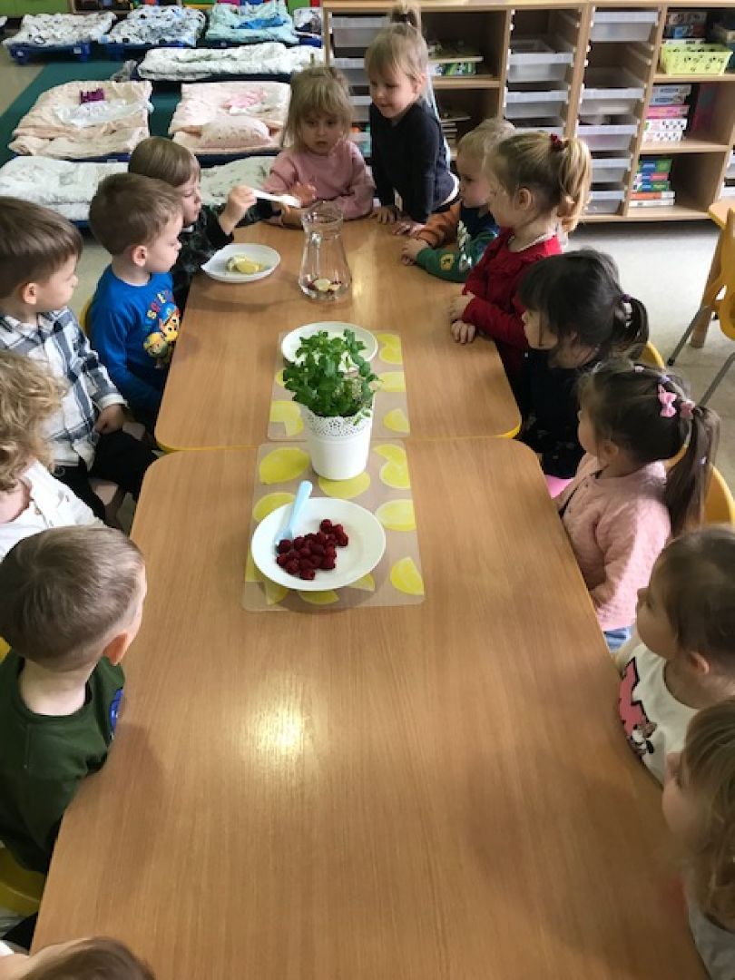 Cytrynki w minionym tygodniu rozpoczęły przygotowania do Świąt Bożego Narodzenia. Dzieci wysłuchały opowiadania pt. „ Poranne sprzeczki widelca, łyżki i noża” M. Jelonek. Odwzorowywały układ talerzy i sztućców - zapoznając się przy tym z zasadami savior-vivre’u. Dzieci uczestniczyły również w zabawach sensorycznych pt. „Co tak pachnie, co tak smakuje?” rozwijając przy tym zmysł smaku i zapachu. Wykonaliśmy także lemoniadę z dodatkiem owoców i świeżej mięty. Przed nami jeszcze ozdabianie świątecznych pierniczków i uroczysty obiad wigilijny….