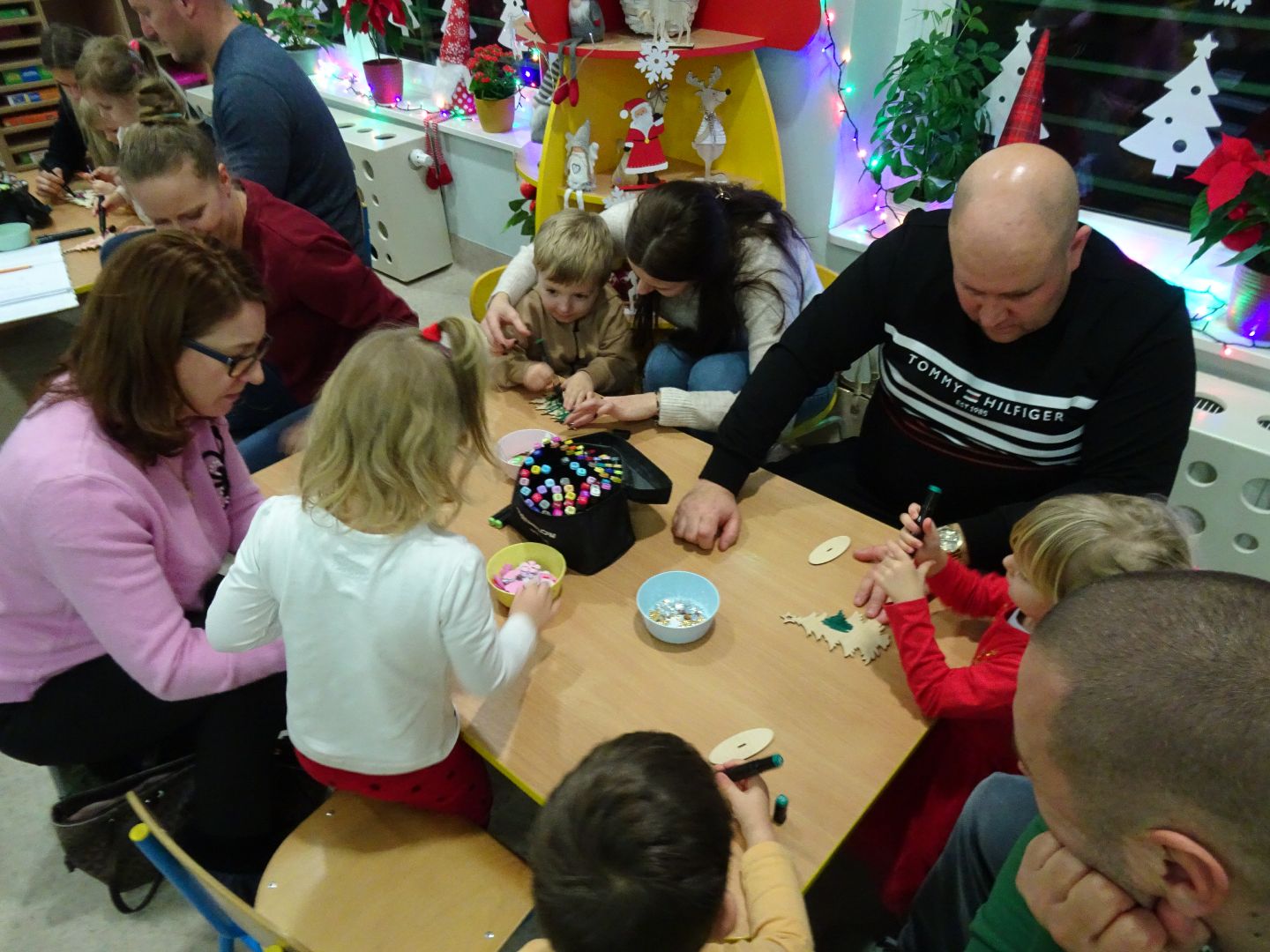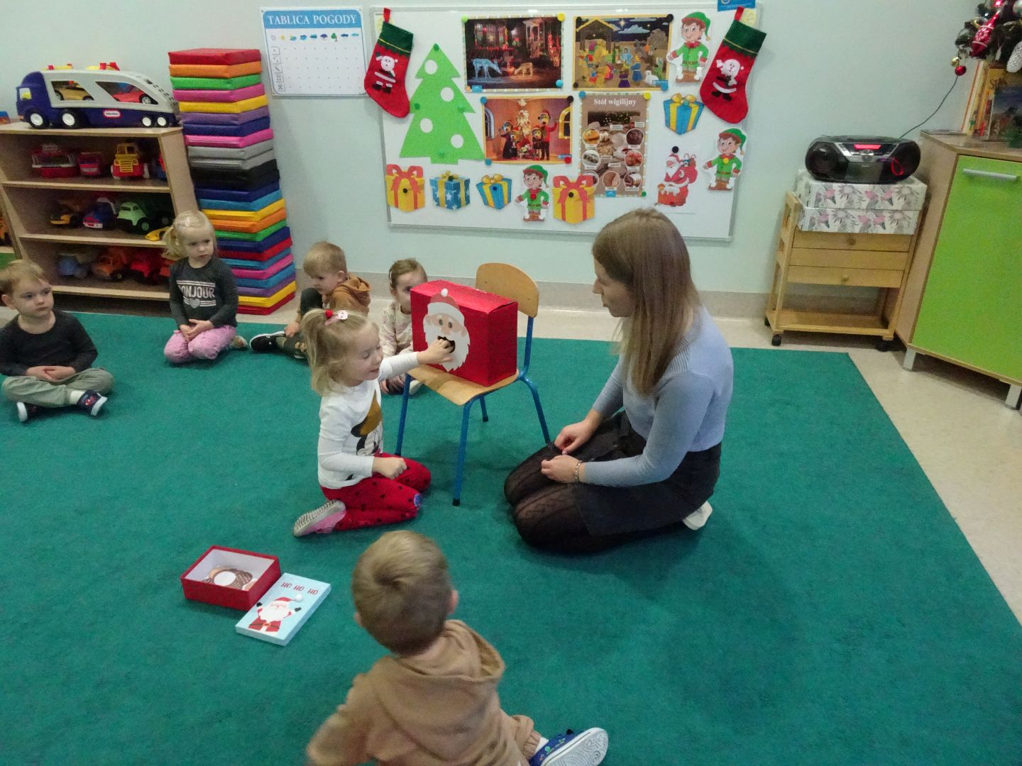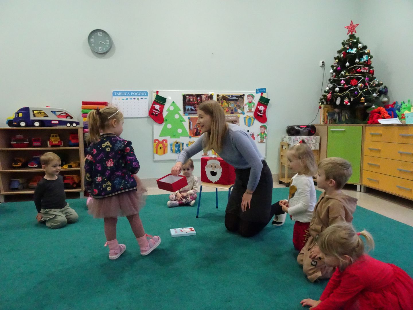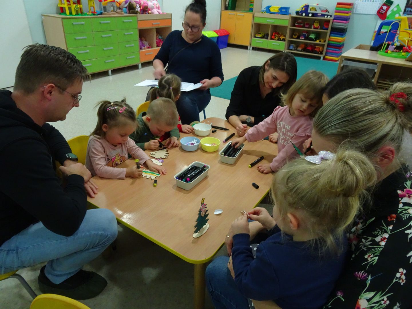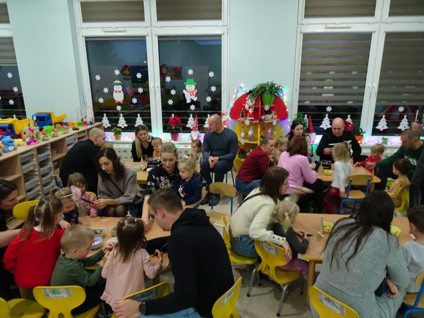 W poniedziałek, 16 grudnia 2024 r. odbyły się w gr. I ,,Cytrynki'' zajęcia otwarte z rodzicami ,,W świątecznym nastroju''. Dzieci miały okazję pokazać, jak duże zrobiły postępy i czego się nauczyły od początku roku szkolnego. ,,Cytrynki'' recytowały wiersz o choince i zaśpiewały pięknie piosenkę o Mikołaju. W zabawach matematycznych ozdabiały choinkę odpowiednią ilością pomponów, czyli bombek. Nakarmiły też Mikołaja, przeliczając przy okazji ciasteczka, które nasz kartonowy Mikołaj zajadał ze smakiem. Dzieci razem z rodzicami na warsztatach plastycznych kolorowały mazakami drewniane choinki, a następnie ozdabiały je naklejkami według własnego pomysłu. Wszystkie wyszły przepiękne i bardzo pomysłowe! Rodzicom dziękujemy za obecność i zabawę z naszymi ,,Cytrynkami''.