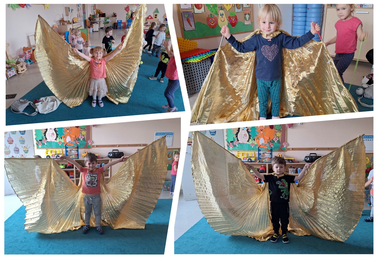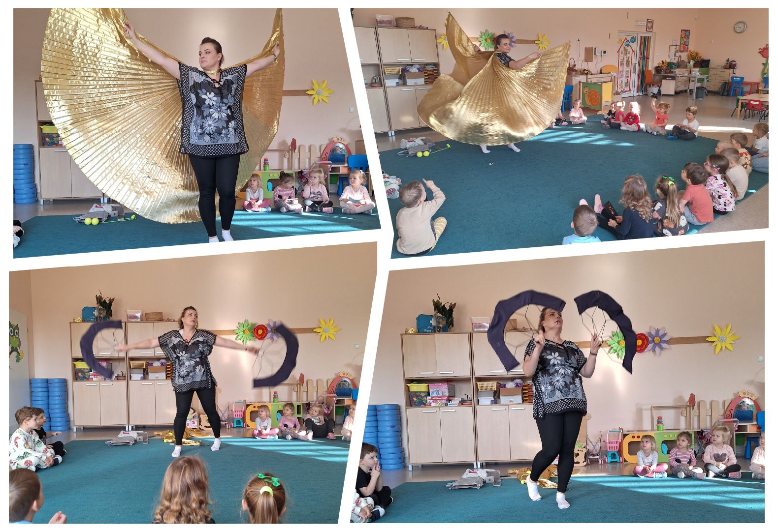 Dziś odbyły się wyjątkowe zajęcia z mamą Ani, która przygotowała dla dzieci niezwykły pokaz tańca z ogniem - tym razem bez prawdziwego ognia, ze względu na odbycie się pokazu w sali przedszkolnej. Dzieci z ogromnym zachwytem podziwiały różnorodne rekwizyty używane w tańcu. Najwięcej radości sprawiło im oglądanie kolorowych wstązek, obręczy i pięknej złotej peleryny. To bylo fascynujące spotkanie, które na długo pozostanie w pamięci przedszkolaków!