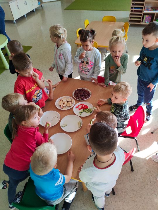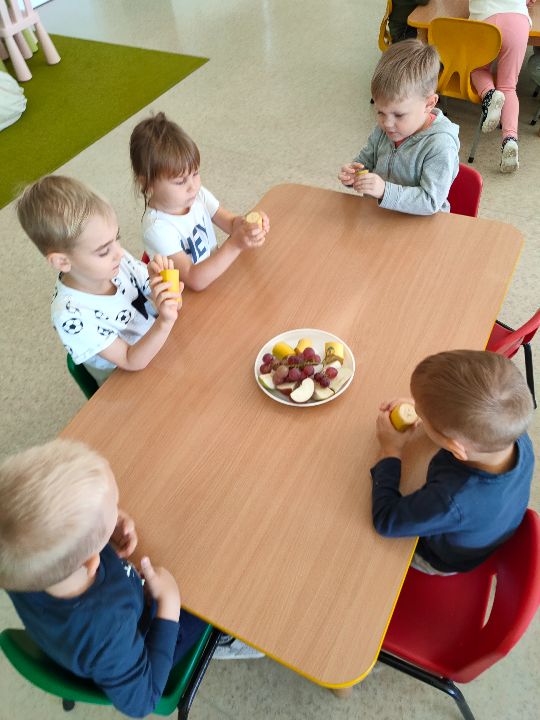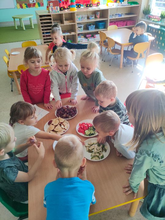 W zeszłym tygodniu Limonki poruszały smaczną tematykę :) mówiliśmy sobie o owocach i warzywach. Oglądaliśmy film o sadzie i ogrodzie, rozwiązywaliśmy multimedialne zagadki, próbowaliśmy rozpoznać owoce i warzywa za pomocą dotyku, a później również smaku. Utrwaliliśmy pojęcia "owoc", "warzywo", "sad", "ogród". Podzieliliśmy skarby jesieni na warzywa i owoce. Przeliczaliśmy zebrane dary, ustalaliśmy gdzie jest więcej, gdzie mniej. Poznaliśmy również z czego składa się owoc, a także porównywaliśmy wielkość pestek. Ćwiczyliśmy również paluszki rwąc bibułę i robiąc z niej małe groszki :) W zeszłym tygodniu urodziny świętowała z nami Ola, której jeszcze raz składamy serdeczne 100 lat :) :) :)