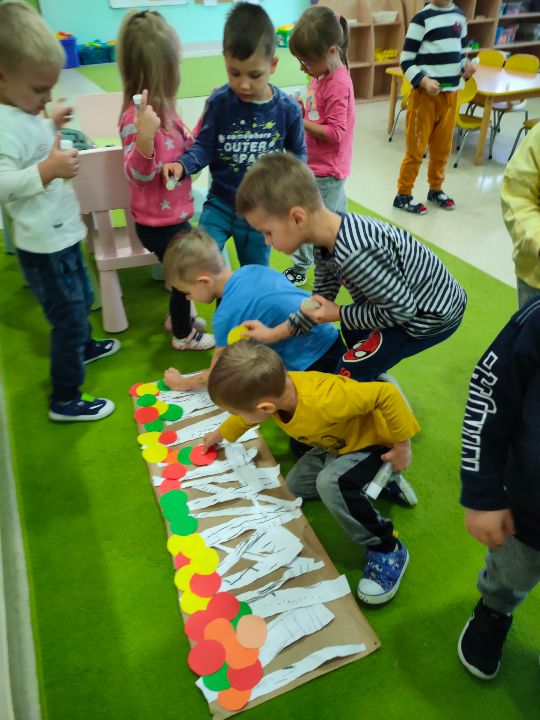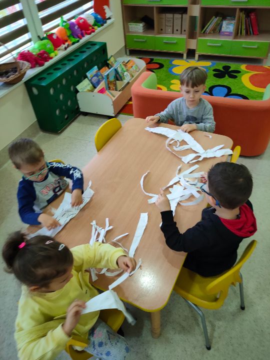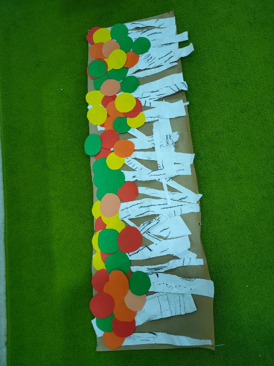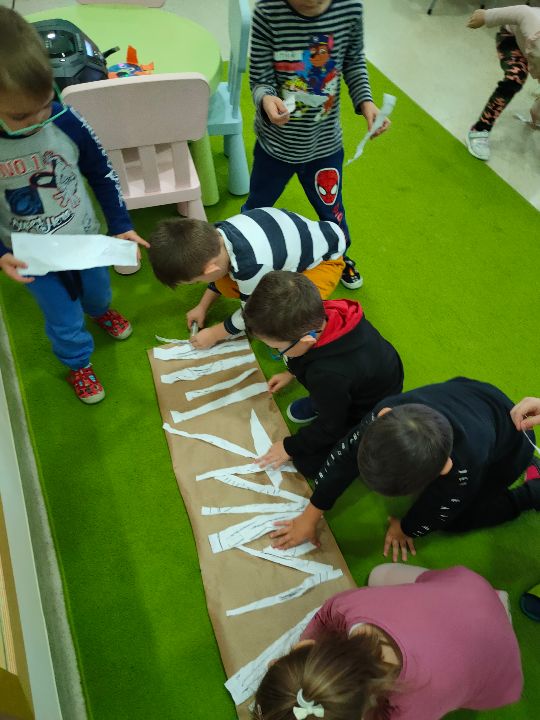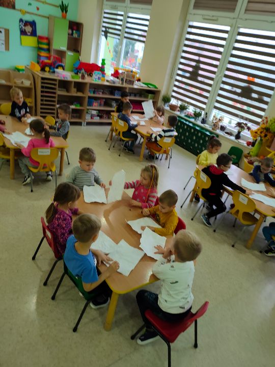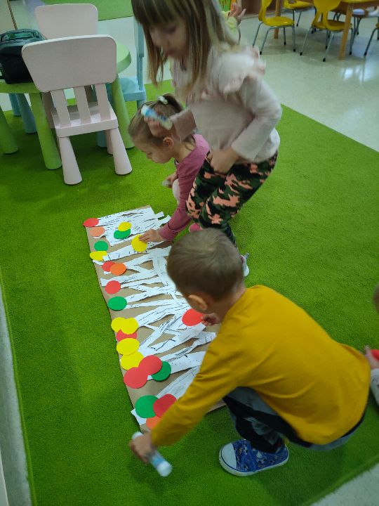 Pracę rozpoczęliśmy od zabaw z kartką przy akompaniamencie muzyki. Później przystąpiliśmy do kreślenia linii przy rytmicznym wymienianiu się kartkami z kolegami ze stolika. Gdy nakreśliliśmy już mnóstwo kresek przystąpiliśmy do nauki rwania kartki na długie elementy- tak powstały nasze pnie. Po ich przyklejeniu mieliśmy już prawie brzozowy lasek... Brakowało jedynie liści! Szybko dokleiliśmy je do naszej wspólnej pracy i jesienny las gotowy... A poniżej efekty naszej pracy :)