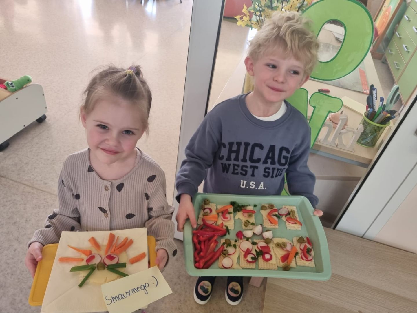 W tym tygodniu w naszej grupie było bardzo egzotycznie. Dzieci poznały zwierzęta żyjące w Afryce oraz ich naturalne środowisko. Najbardziej zaciekawił ich wygląd żyrafy i słonia. Z zainteresowaniem oglądały ilustracje w albumach, wyklejały sylwety zwierząt bibułą. Z chęcią też przynosiły do przedszkola maskotki, książeczki czy figurki zwierząt egzotycznych komponując nasz grupowy egzotyczny kącik. Na swoich talerzykach skomponowały warzywnego lwa z marchewki, rzodkiewki, papryki. Zdrowo i pysznie 😊