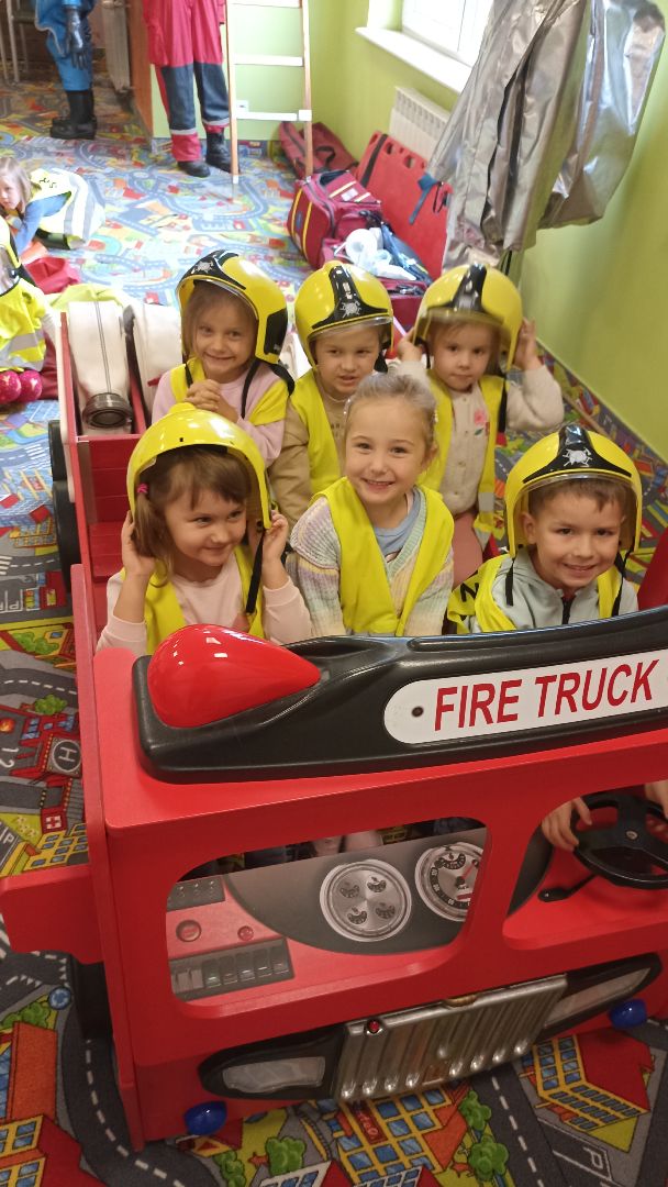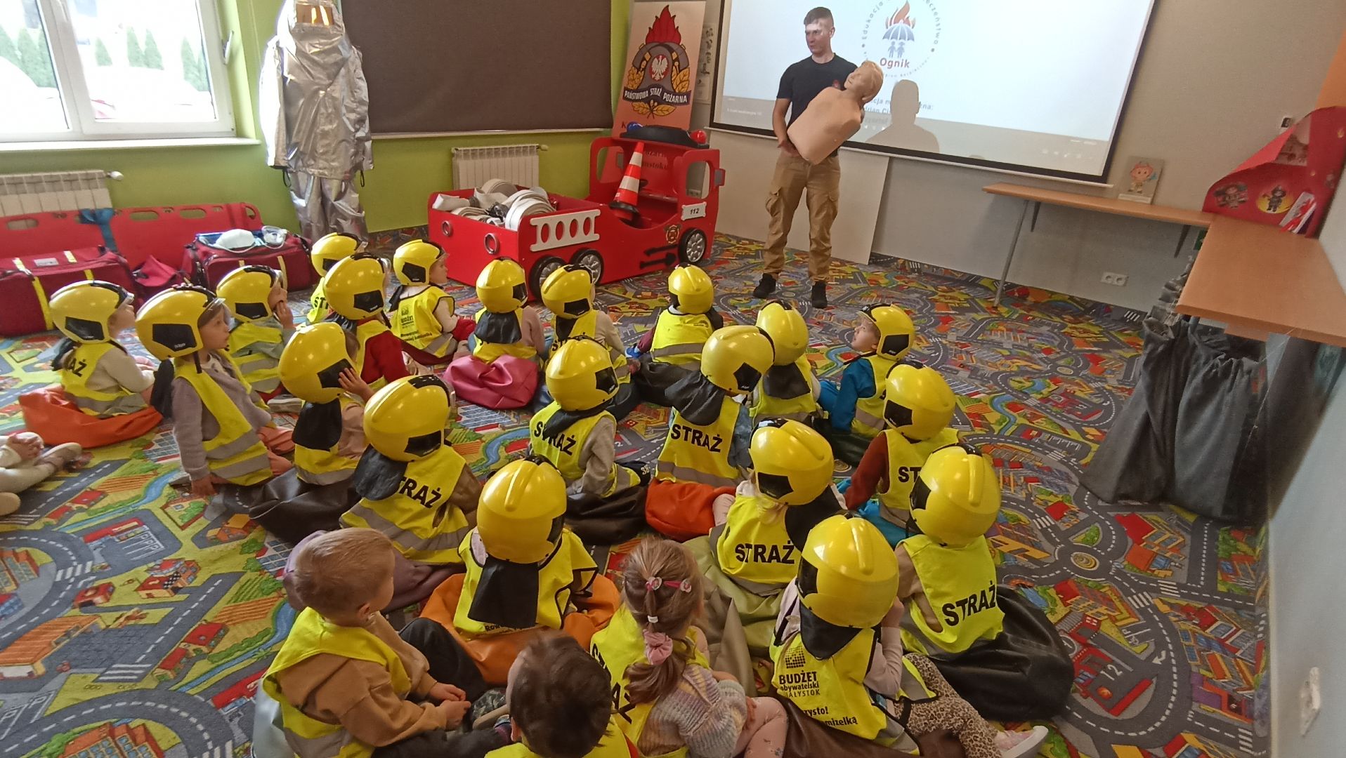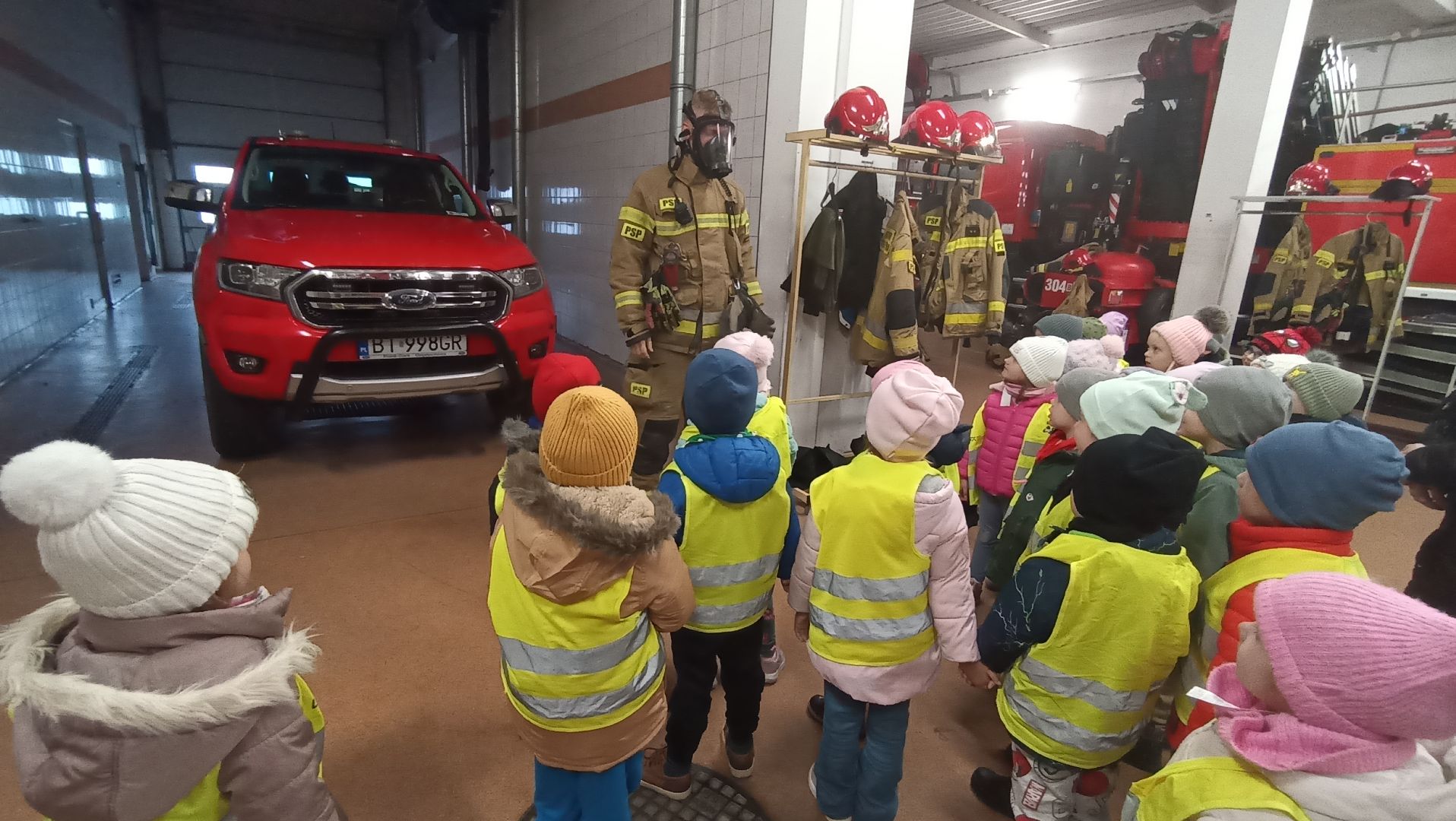 Dnia 29.10.2025 grupa „Limonki” wybrała się na niezwykle interesującą wycieczkę do Straży Pożarnej (Jednostka Ratowniczo- Gaśnicza nr 4 w Białymstoku). Na dzieci czekało wiele atrakcji oraz cennych doświadczeń związanych z bezpieczeństwem. Najpierw przedszkolaki uczestniczyły w zajęciach edukacyjnych w sali „Ognik”. Oglądały filmy instruktażowe dotyczące właściwego zachowania się w sytuacjach zagrożenia oraz poznały zasady bezpiecznej ewakuacji. Dużym zainteresowaniem cieszyły się zajęcia z nauki podstaw pierwszej pomocy, podczas których dzieci mogły utrwalić wiedzę o udzielaniu pomocy w nagłych sytuacjach. Strażacy opowiedzieli również o swojej odpowiedzialnej i pełnej wyzwań pracy, demonstrując elementy wyposażenia i umundurowania, a także prezentując specjalistyczny sprzęt. Dzieci mogły z bliska obejrzeć wozy strażackie, zaglądnąć do środka i dowiedzieć się, do czego służą poszczególne urządzenia. Serdecznie dziękujemy Straży Pożarnej za ciepłe przyjęcie i ciekawą lekcję bezpieczeństwa!