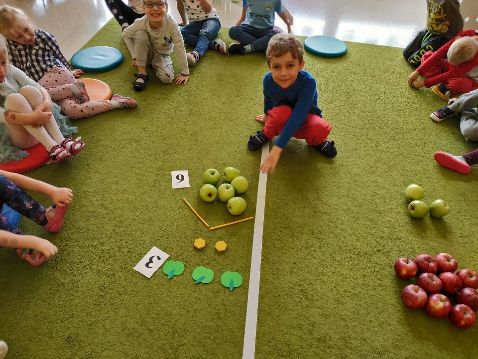 Za oknami szaro i ponuro, ale nikt nie powiedział, że i w sali tak ma być! :) Mandarynki poznając dary jesieni sprawdzały jak smakuje i wygląda jabłko w środku. Odbył się konkurs na najlepsze jabłko. Po obserwacji, degustacji i głosowaniu wygrało jabłko z czerwoną skórką! :) Bawiły się w porównywanie i liczenie jabłek, tworzenie zbiorów i rytmów, określanie kolejności oszczególnych jabłek, oraz przyswajały sobie wygląd liczb. Z pozostałych jabłek tworzyły jabłkowe ludziki. Śmiechów było przy tym co nie miara, a prace wyszły do schrupania! :)