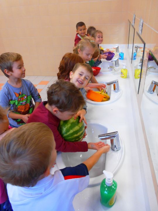 „Mandarynki” w tym dniu wysłuchały bardzo pouczającego wierszyka o Kasi, która jadła duże ilości niezdrowych produktów. Dowiedziały się, jak wielkie znaczenie ma zdrowa dieta, która wcale nie musi być nudna, a tym bardziej niesmaczna! W ramach realizacji programu własnego „Na zdrowie!” wspólne przygotowały zdrową wersję „pizzy arbuzowej”, która ku zaskoczeniu wszystkich dzieci - smakowała wybornie!!! Liczne prośby o dokładki świadczyły o tym, że nasz kulinarny eksperyment zastąpienia fast foodów owocowym deserem się powiódł!!!