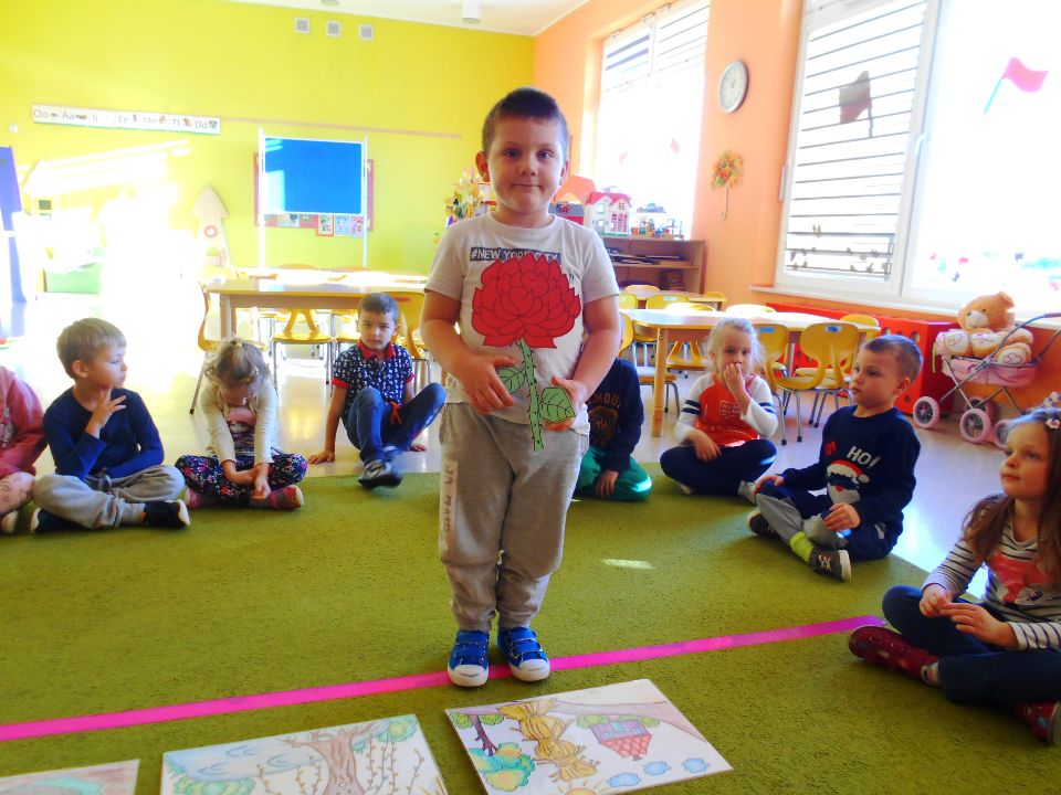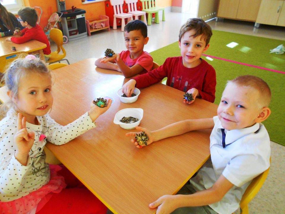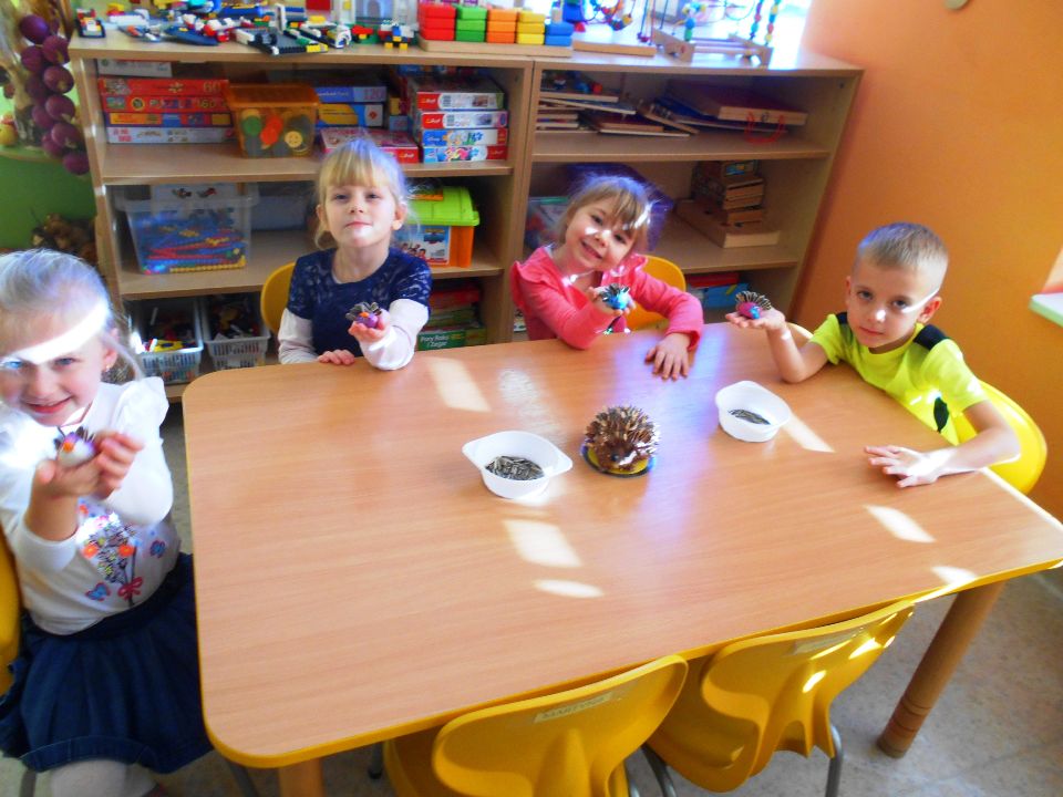 Niedawno rozmawialiśmy o przygotowaniach zwierząt do zimy. W związku z tym wysłuchaliśmy zabawnej opowieści H. Bechlerowej pt. „Jak Kolczatek szukał mieszkania”. Dzieci z zaciekawieniem śledziły losy głównego bohatera, poznały typowe zwyczaje zwierząt leśnych i dowiedziały się, kto zapada w sen zimowy. Następnie wykonały przepiękne „plastelinkowe jeżyki” z ostrymi igłami z pestek. Wyglądały uroczo! A kiedy wydawało się, że nasze rozważania na temat zimowych mieszkań zwierząt zostały już zakończone – odwiedziła nas mama naszego Marcelka. Pani Ula przeczytała nam pouczającą bajeczkę o „Łakomym jeżyku”, który doświadczył złych skutków swojego obżarstwa. Na szczęście wszystkie „Mandarynki” doskonale wiedzą na czym polega zdrowe odżywianie i aktywny tryb życia!