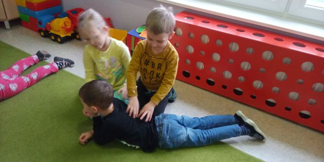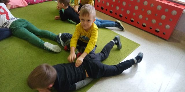,,Mandarynki'' bawiły się w ,,Lustro'', a więc starały się wykonywać takie same ruchy jak kolega, ,,Koncert gry na plecach'' - grały paluszkami na plecach drugiej osoby. Wiele zabawy było przy ćwiczeniu ,,Naleśniki'', czyli turlaniu się. W ,,Przepychankach'' dzieci plecami musiały przesunąć swojego partnera w zabawie. Najbardziej spodobała się dzieciom zabawa w ,,Ślepca'', która wymaga wiele zaufania do drugiej osoby, jak i odpowiedzialności od dzieci prowadzących za rękę osoby z zamkniętymi oczami.