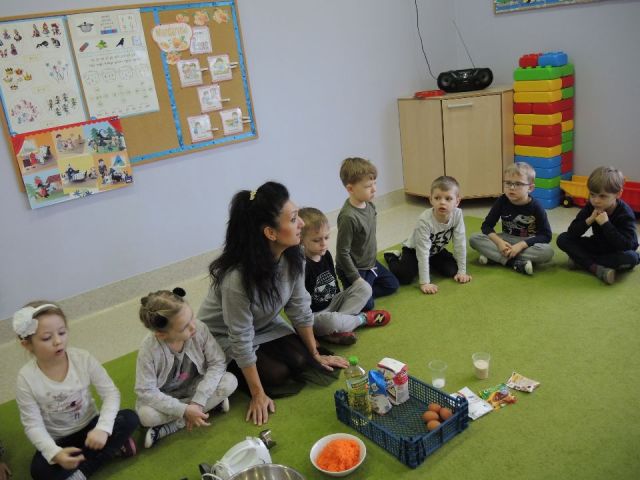 Wszystkie dzieci lubią słodkie "co nie co". Ale słodkie i zdrowe to już przepychota. Dlatego "Mandarynki" postanowiły uhonorować Dzień Ciasta Marchewkowego w swojej grupie. Najpierw utrwaliły wiadomości o zdrowotnych właściwościach marchewki oraz innych produktów spożywczych, a następnie wykonały ciasto marchewkowe. Najlepsze zostało na koniec! Degustacja - mniam!