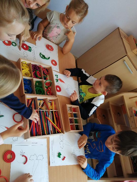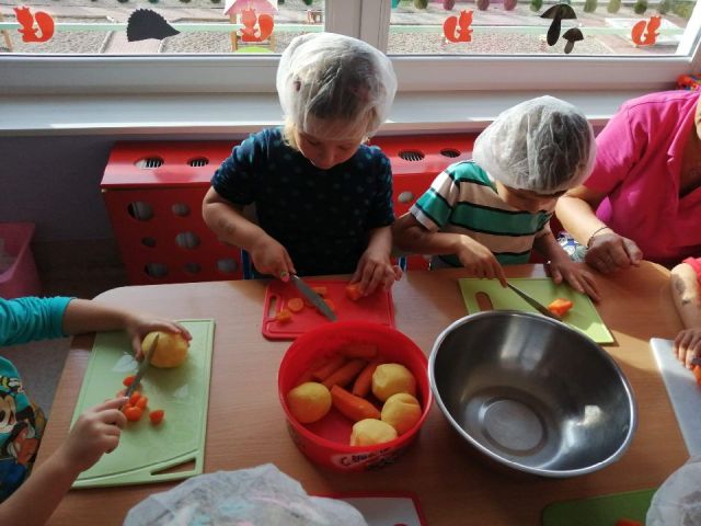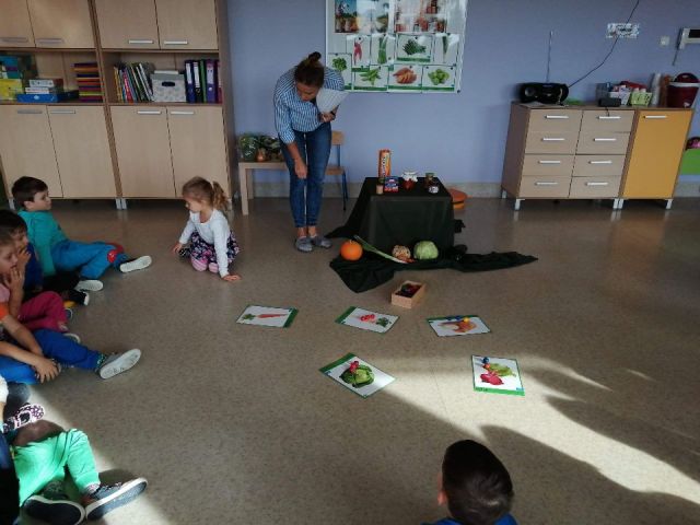 W tym tygodniu Mandarynki poznały wiersz Jana Brzechwy "Na straganie", który oglądnęły jako przedstawienie w formie teatrzyku stolikowego, z wykorzystaniem darów Froebla. Podczas zajęć poznały nazwy warzyw, sposoby ich wykorzystania w kuchni. Odgadywały zagadki o warzywach, dzieliły wyrazy na sylaby, liczyły, wskazywały nazwy brył geometrycznych z daru 2 (walec, sześcian, kula). Po zajęciach w kole, pracowały w czterech zespołach zabawowo-zadaniowych (gospodarczy, twórczy, darów i badawczy). Układały warzywa z darów, badały co warzywa mają w środku, zrobiły jeże z ziemniaka i groszku oraz przygotowały pyszną i zdrową sałatkę jarzynową. Na koniec tygodnia poznały cyferkę 3, którą ułożyły z darów oraz wypiły sok marchewkowy.
