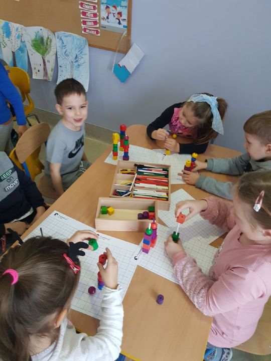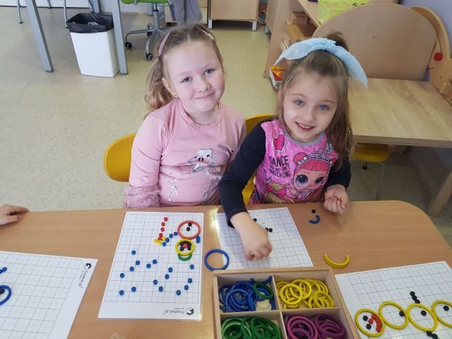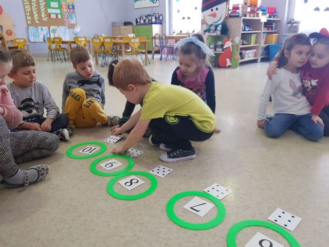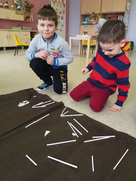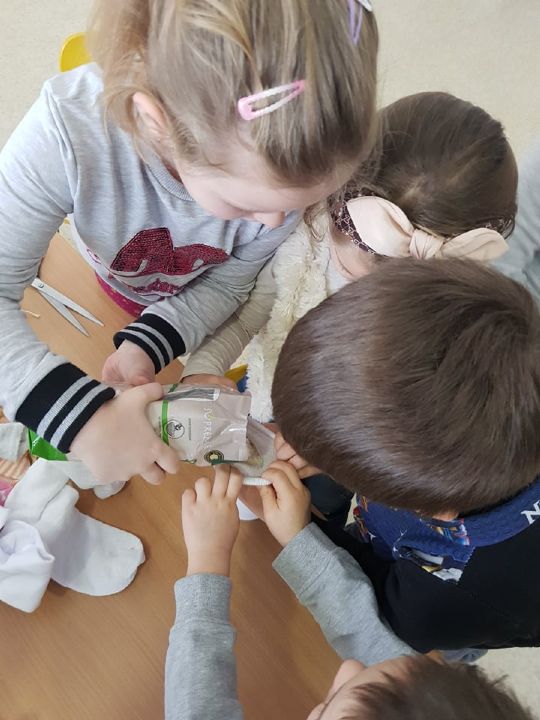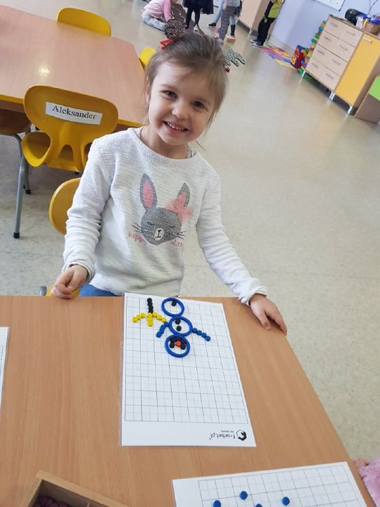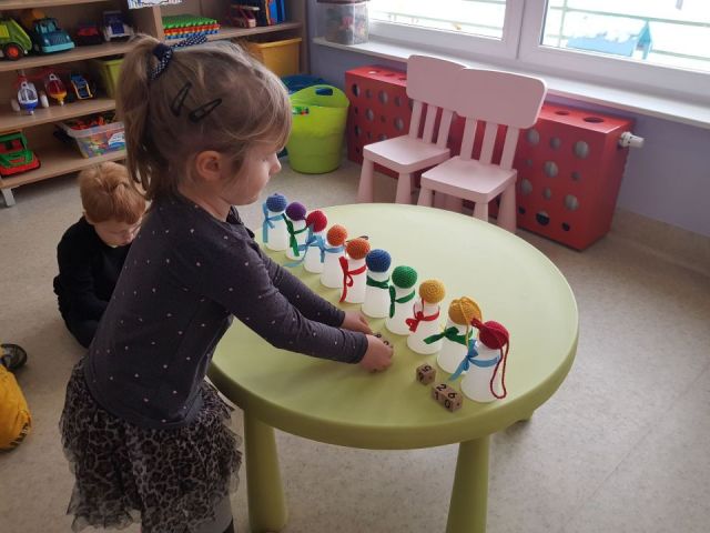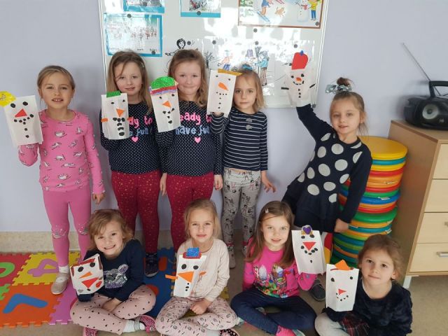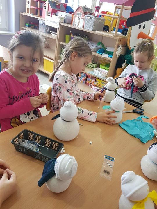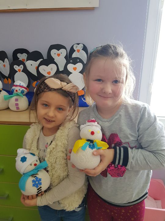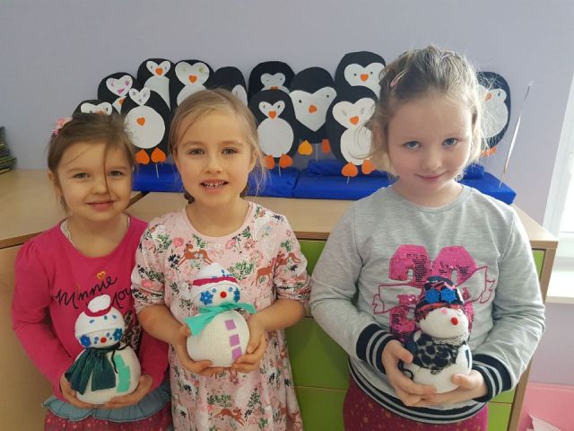 W tym tygodniu Mandarynki poznały zasady bezpiecznej zabawy na śniegu, zabawy bezpieczne i niebezpieczne. Podczas zabaw poznały literkę „E,e”, nauczyły się śpiewać piosenkę „Ulepimy bałwana”. Dzieci wykonały bałwanki z ryżu i skarpetki, wszystkie ozdobiły nasz parapet w sali. Od razu zrobiło się zimowo. Na koniec tygodnia oglądały teatrzyk freblowski na podstawie wiersza W. Chotomskiej „Dziesięć bałwanków”, podczas którego to utrwalały liczenie w zakresie 10 oraz aspekt główny i porządkowy liczb, a potem same wcieliły się w role bałwanków. Układały z darów Froebla bałwanki, krajobrazy, tor saneczkowy. Wykonaliśmy także eksperyment o kryształkach soli. Wlaliśmy do słoików roztwór wody i soli, umieściliśmy w nich sznurek i postawiliśmy słoiczki w kąciku badawczym w sali. Teraz pozostało już tylko czekanie na kryształki!