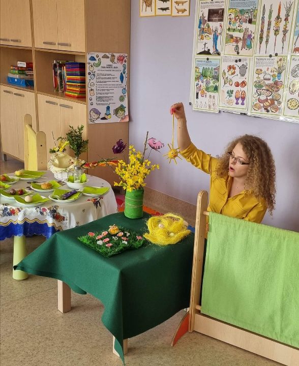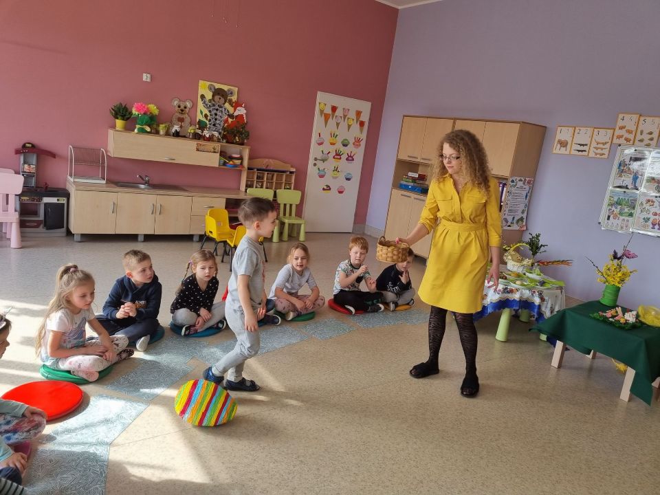 Dzisiaj w "Mandarynkach" odbyły się zajęcia z udziałem Pani Dyrektor pod tytułem "Wielkanocne zabawy dydaktyczne z elementami metody Froebla.". Dzieci wysłuchały krótkiej "Bajeczki Wielkanocnej", rozwiązywały zagadki oraz układały pisankowe puzzle. W kąciku badawczym "Mandarynki" oglądały prze lupę różne ziarna oraz sadziły rzeżuchę. Kącik twórczy wyklejał kolorową bibułą papierowe jajko. Kącik gospodarczy wykonał pisankowe kanapki. Kącik darów tworzył kolorową pisankę. Dzisiaj w "Mandarynkach" było czuć świąteczny klimat! :)