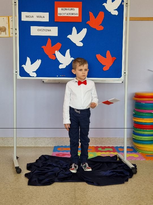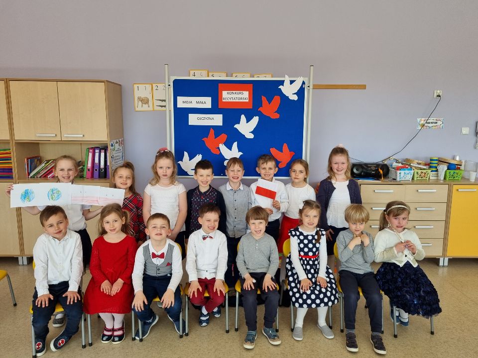 W środę odbył się w naszej grupie konkurs recytatorki. Chętne dzieci, które nauczyły się  wiersza J. Białobrzeskiej pt. "Moja mała Ojczyna" mogły wyrecytować go przed całą grupą. Celem konkursu było rozwijanie postawy patryiotycznej  wśród dzieci, kształtowanie pamięci mechanicznej oraz przełamywanie nieśmiałości przed występem publicznym. Wszystkie dzieci pięknie recytowały, były bardzo dobrze przygotowane. Na koniec dzieciom zostały wręczone  dyplomy, nagrody książeczki i słodkości od Pani Dyrektor. Gratulujemy!!!