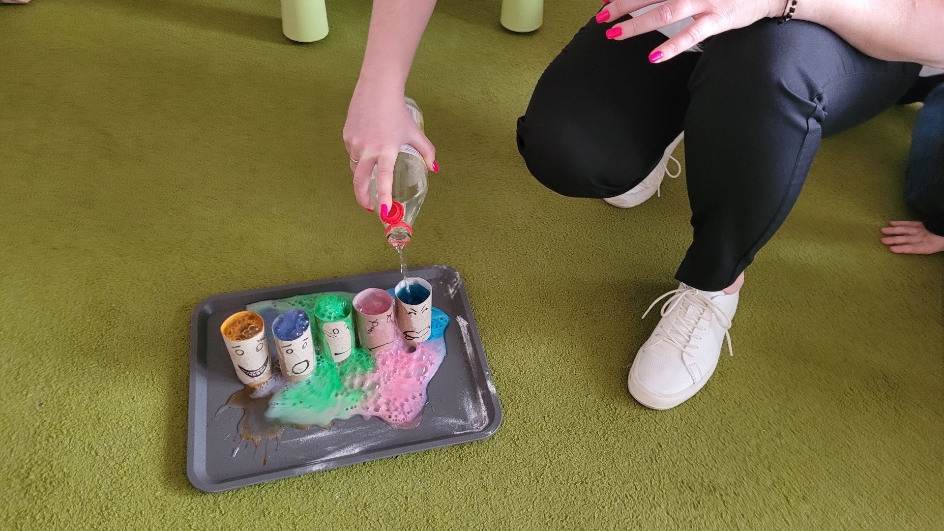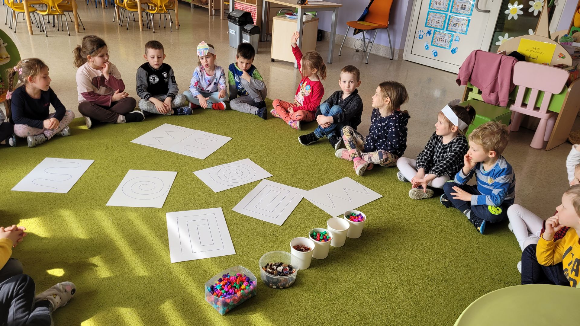 Dzieci na podstawie wiersza „Wiosna” Grażyny Świerczyńskiej za pomocą Darów Froebla zilustrowały wskazany fragment wiersza, tworząc obrazy do usłyszanego tekstu; uczestniczyły w zabawie badawczej „Kolorowy zawrót głowy”; doskonaliły motorykę małą podczas układania „Wiosennych szlaczków”.