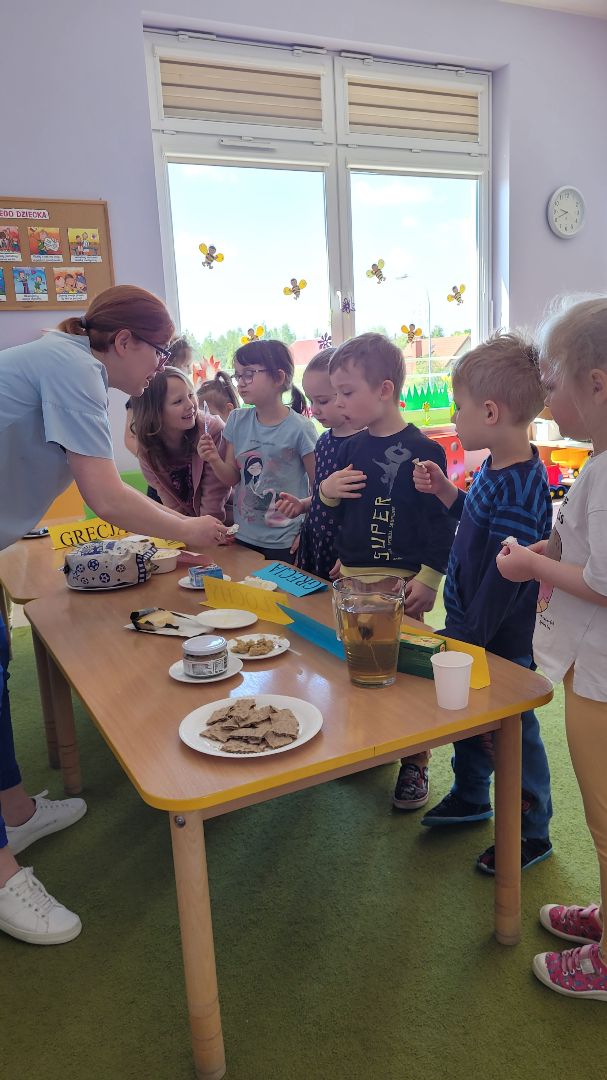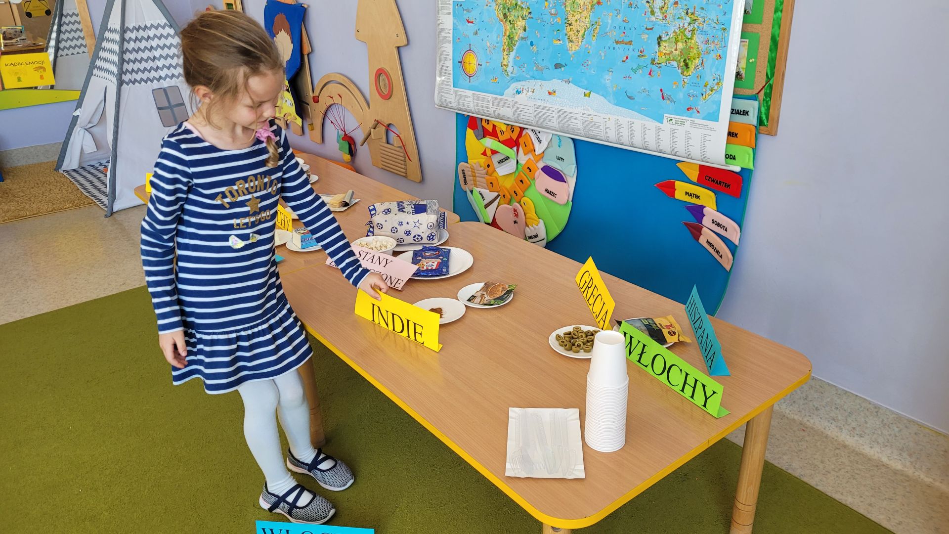 Realizując wybrane zagadnienia programu własnego „Pod okiem ciekawskiego badacza” uczestniczyliśmy w zabawie „Poznajemy smaki świata” degustując, oceniając smaki i nazywając potrawy charakterystyczne dla różnych rejonów świata, próbowaliśmy wskazywać na mapie z jakich rejonów świata pochodzi dany produkt.