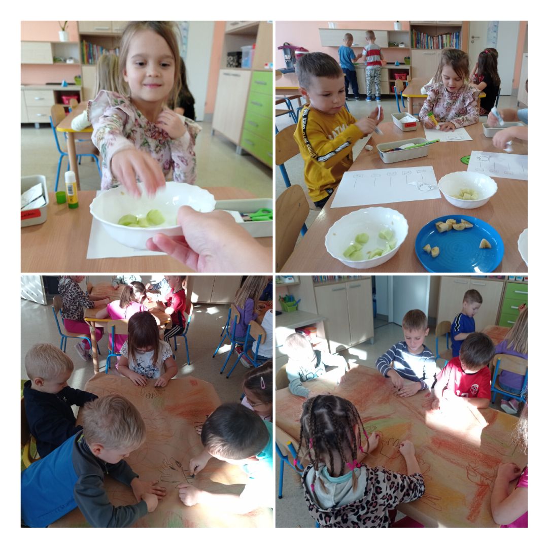 - Tworzyliśmy grupową pracę plastyczną pt.: ,,Jeże na spacerze'' malując i poruszając się do muzyki.