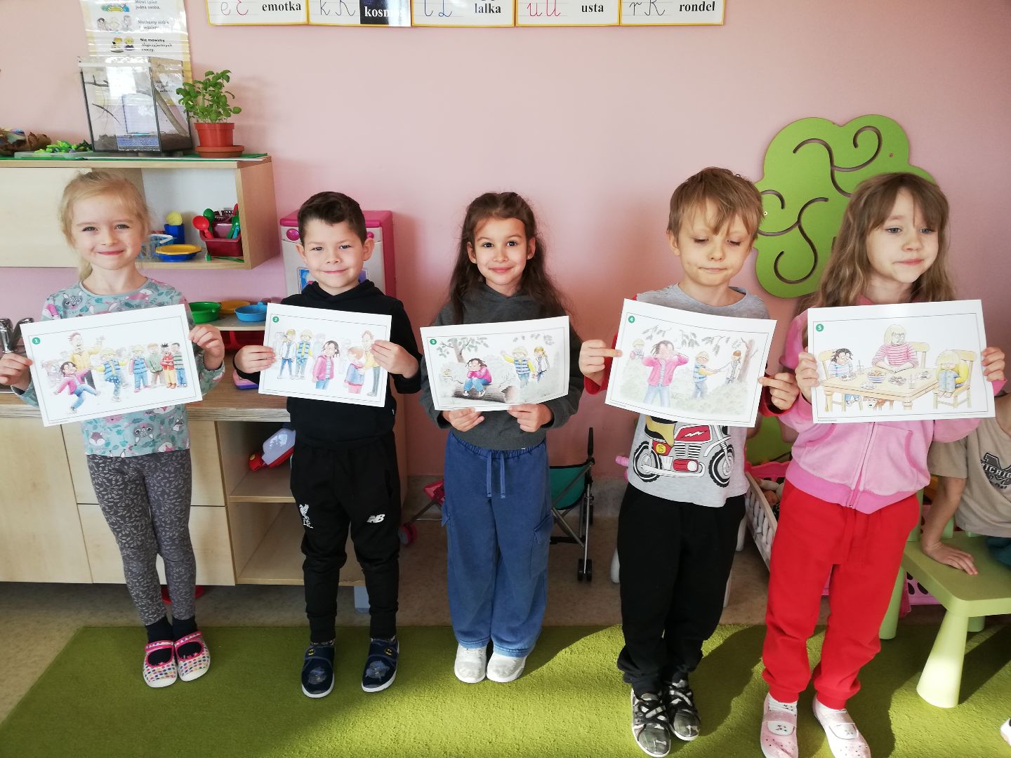 W tym tygodniu na zajęciach w ramach programu ,,Przyjaciele Zippiego" rozmawialiśmy o PRZYJAŹNI. Celem naszego cotygodniowego spotkania było nabycie umiejętności nawiązywania przyjaźni oraz radzenia sobie z odrzuceniem i samotnością. Przedszkolaki wykonały wiele ciekawych zadań, w których mogły przećwiczyć poznane zasady i sposoby na utrzymanie przyjaźni. Dzieci wykonały własne kukiełki przedstawiające przyjaciół. Następnie każde dziecko mogło przedstawić pozostałym swojego przyjaciela (kukiełkę) oraz o nim opowiedzieć.