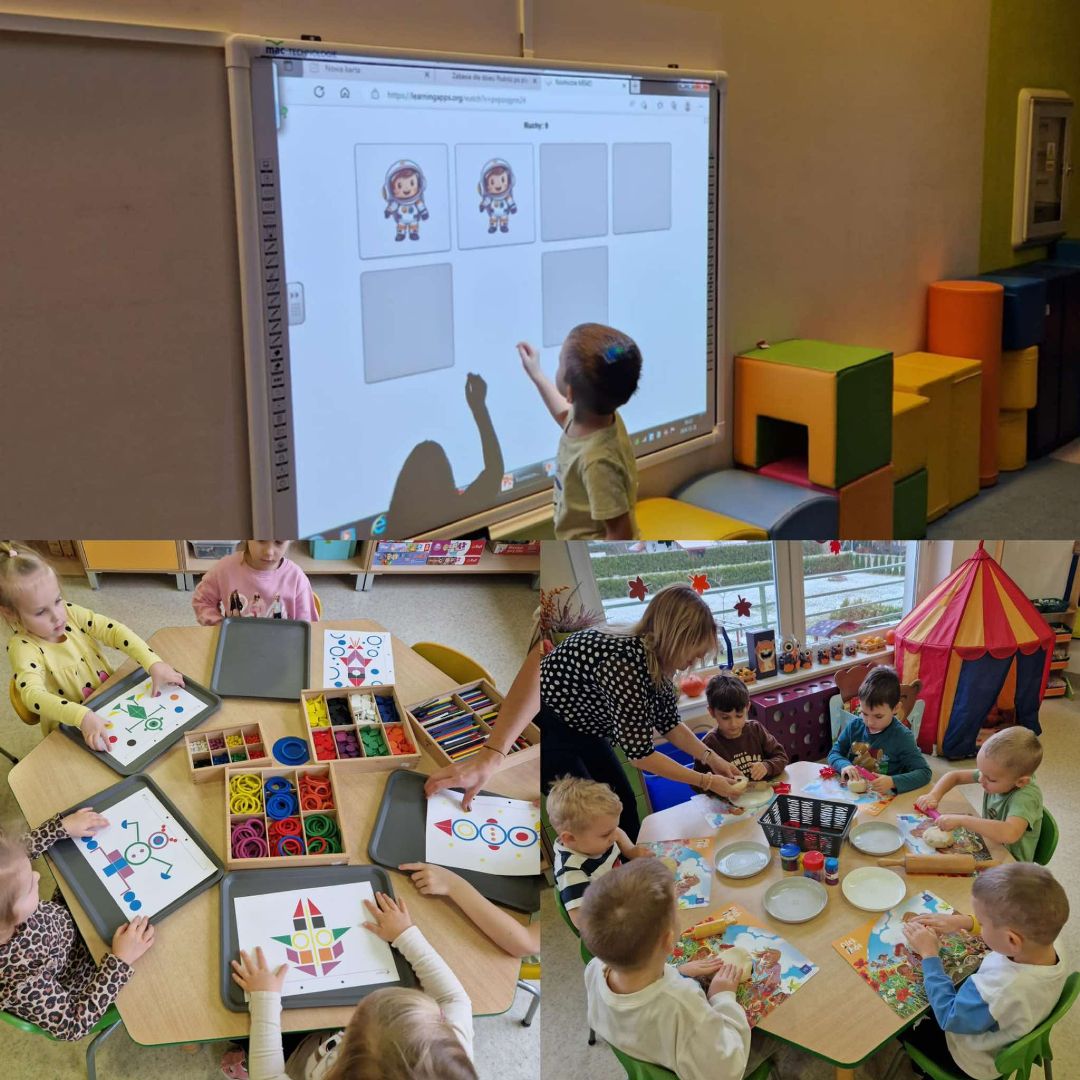 - pobudziliśmy swoje zainteresowanie tematyką dotyczącą kosmosu, wiemy jak nazywają się nasze planety w układzie słonecznym, zrobiliśmy kosmos w słoiku, a na podsumowanie tygodnia rozwijaliśmy kompetencje cyfrowe bawiąc się na tablicy multimedialnej w kosmiczne zagadki,
