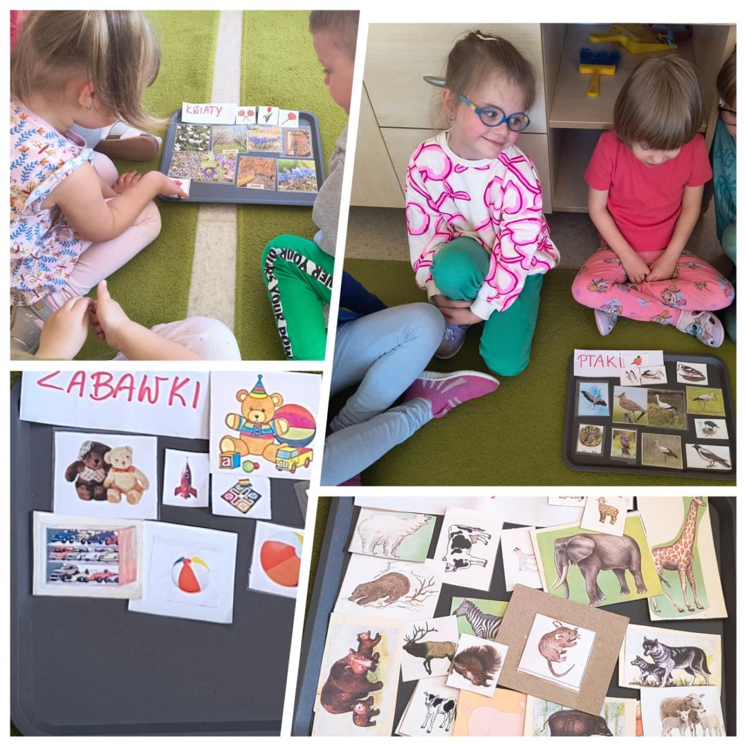 -rozwijały umiejętności związane z klasyfikacją, segregowały obrazki ułożone na tackach i układały je w grupy tj. zwierzęta, ptaki, zabawki, kwiaty,