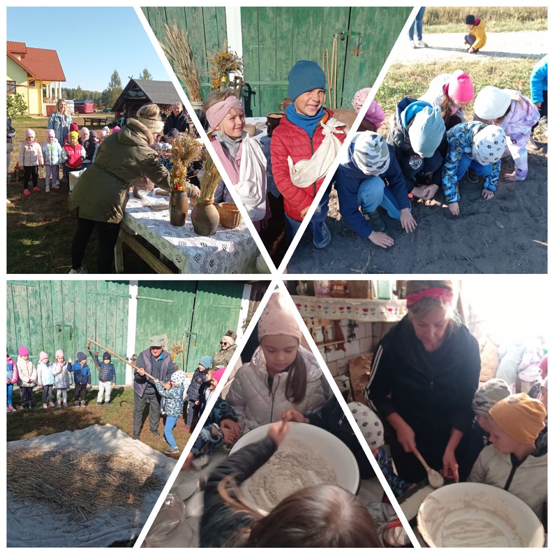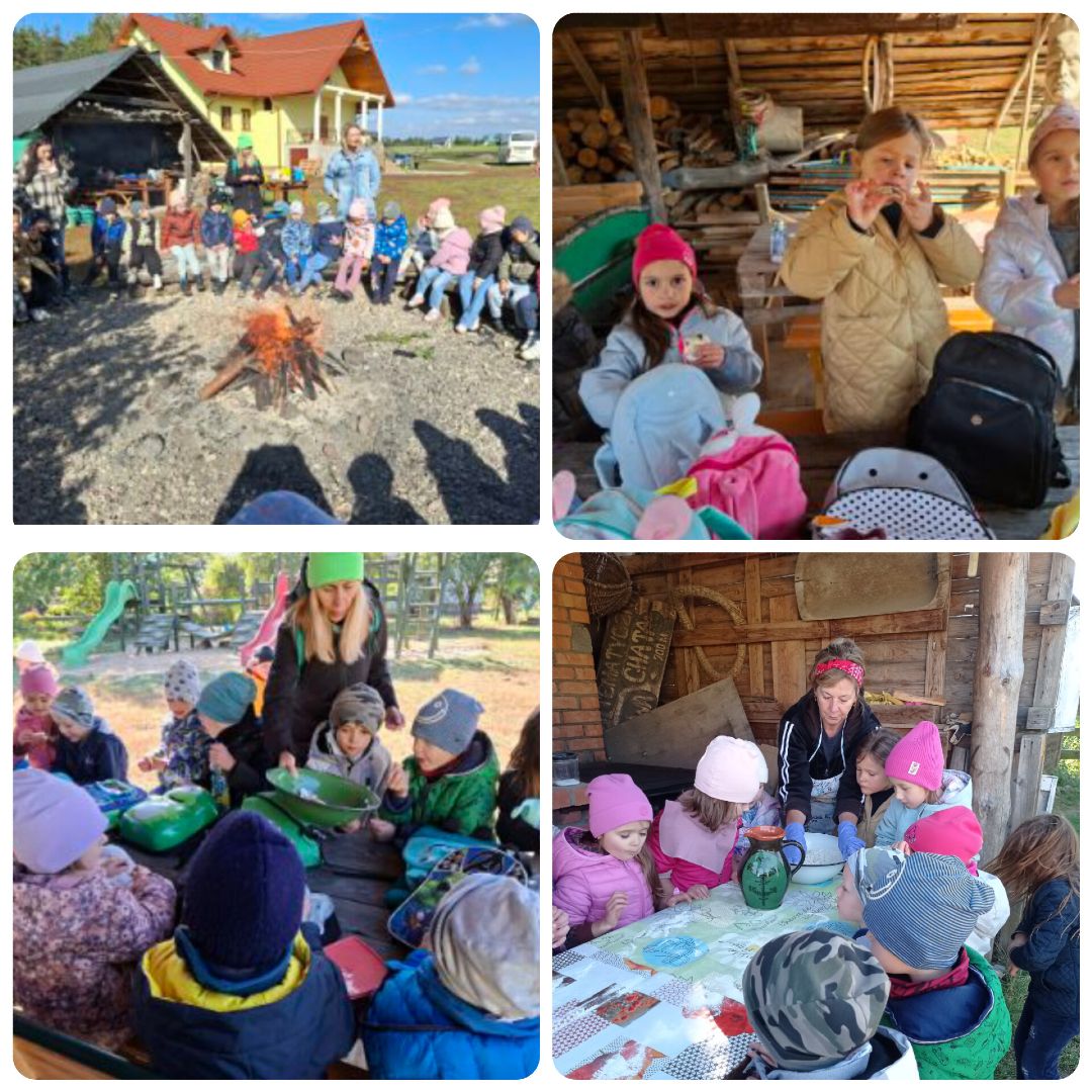 Dziś byliśmy na wycieczce w Pacowej Chacie gdzie mieliśmy okazję wziąć udział w warsztatach ,,Od ziarenka do bochenka". Najpierw Pani pokazała nam rożne zboża (kłosy i ziarna) i opowiedziała jak wyglądało ich sianie w dawnych czasach. Następnie ruszyliśmy na pole by samodzielnie zasiać zboże. Po powrocie gospodarz pokazał dzieciom, a także pozwolił spróbować, młócenia za pomocą cepa. Gdy już dowiedzieliśmy się skąd się biorą ziarna i jak się je oczyszczało w dawnych czasach poszliśmy zwiedzać tradycyjną chłopską chatę, w której wspólnie przygotowaliśmy ciasto na chleb z zakwasem. By umilić dzieciom czas oczekiwania aż chleb się upiecze przygotowywaliśmy podpłomyki, które Pani usmażyła na płycie od pieca, były pyszne! Po zabawach na świeżym powietrzu przyszedł czas na ognisko i samodzielne pieczenie kiełbasek, które dzieci zjadły z samodzielnie wykonanym i już upieczonym chlebem 🙂